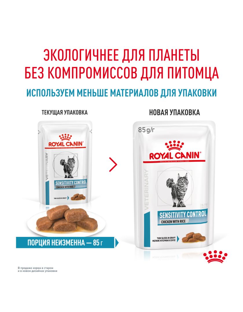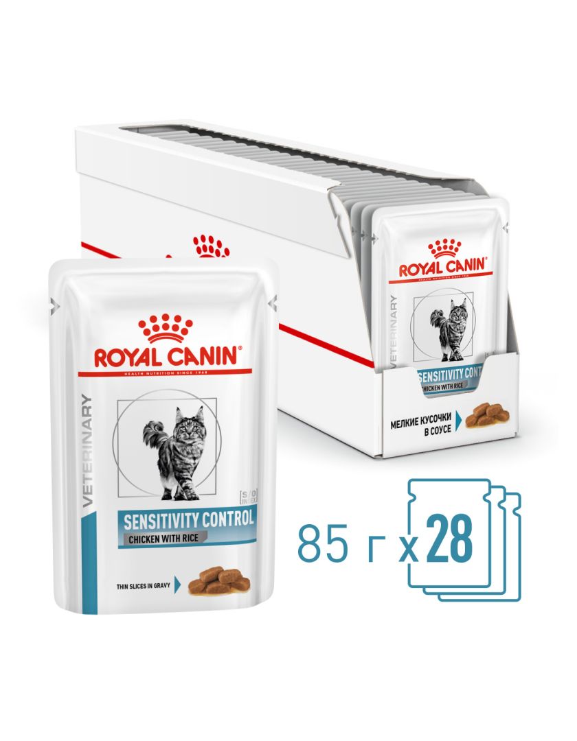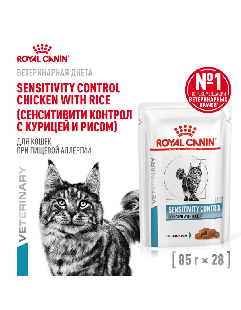Консервированный корм ROYAL CANIN® SENSITIVITY CONTROL CHICKEN WITH RICE (СЕНСИТИВИТИ КОНТРОЛ С КУРИЦЕЙ И РИСОМ), кусочки в соусе — полнорационный диетический корм для кошек, применяемый при пищевой аллергии или пищевой непереносимости некоторых ингредиентов. Специально подобранные источники белков и углеводов позволяют снизить риск развития пищевой аллергии. Формула помогает поддерживать естественный защитный барьер кожи.
