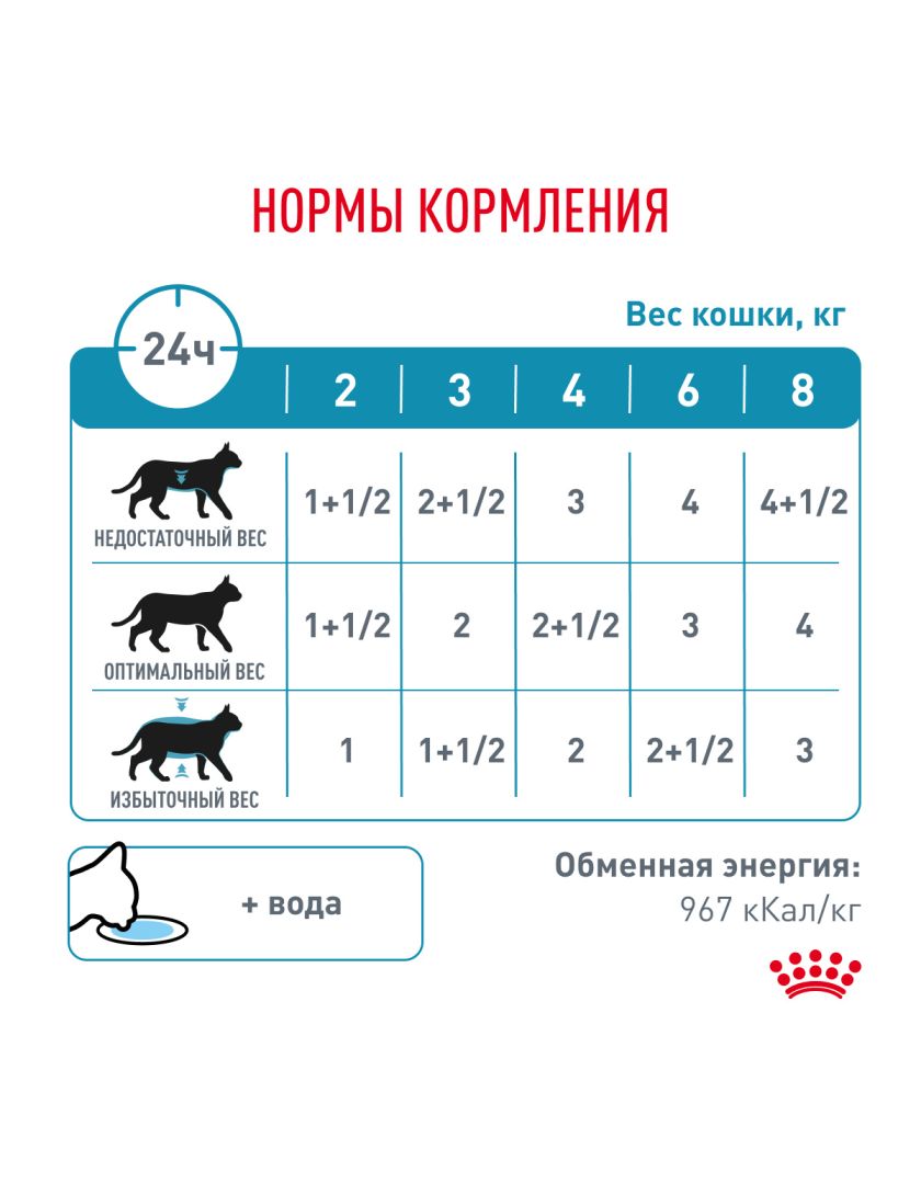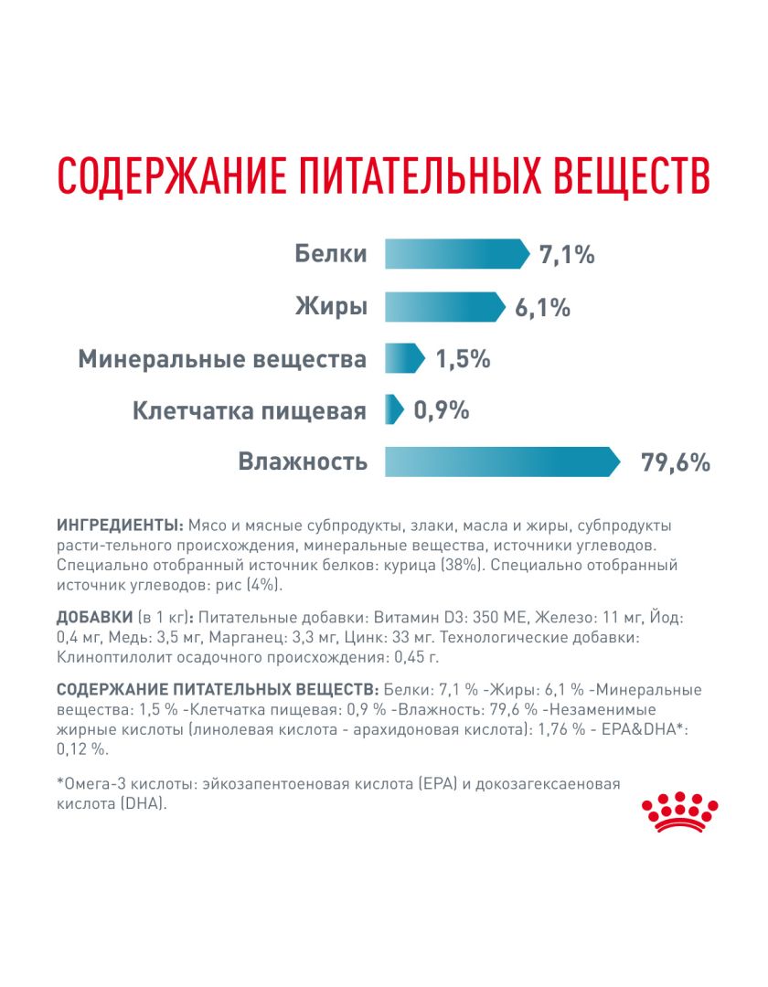 ДОБАВКИ (в 1 кг): витамин А - 5000 МЕ, витамин D3 - 270 ME, железо - 9 мг, йод - 0,4 мг, медь - 1,4 мг, марганец - 1,4 мг, цинк - 24 мг, селен - 0,029 мг. СОДЕРЖАНИЕ ПИТАТЕЛЬНЫХ ВЕЩЕСТВ: белки - 7,1 г, жиры - 6,2 г, зола - 1,8 г, клетчатка пищевая - 1,2 г, влага - 79,8 г, незаменимые жирные кислоты (линолевая кислота - арахидоновая кислота) - 1,55 г, ЭПК/ДГК - 0,12 г. СПОСОБ УПОТРЕБЛЕНИЯ: см. таблицу. Корм готов к употреблению. Проследите, чтобы у вашей кошки всегда была свежая вода.
