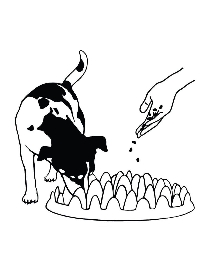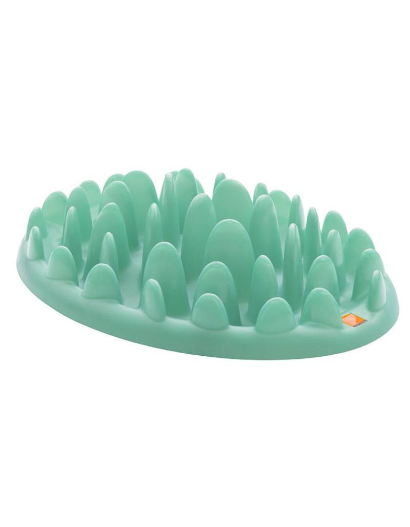Необходимое количество корма разбрасывается по миске, таким образом, собака вынуждена добывать еду - подталкивать кусочки корма между травинками миски. По краю миски имеется высокий бортик, который позволяет использовать влажные корма, а также в миску можно налить примерно 400 мл воды.