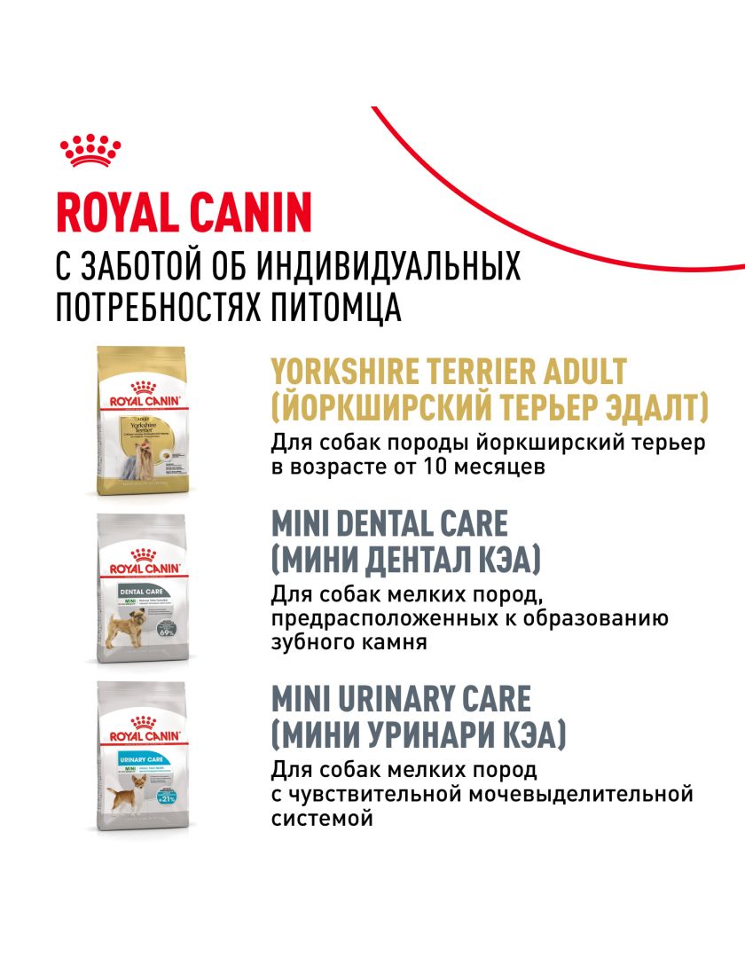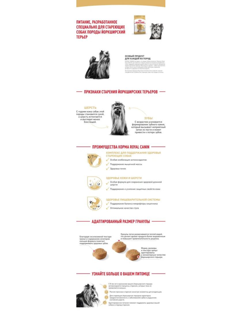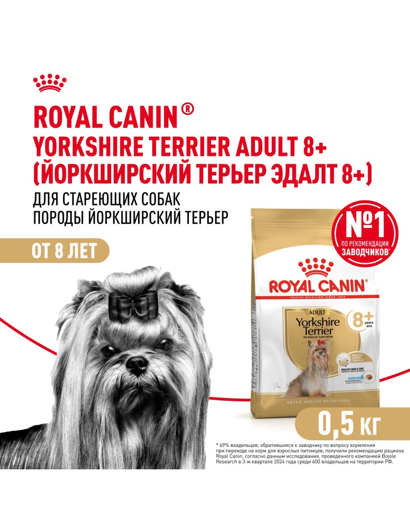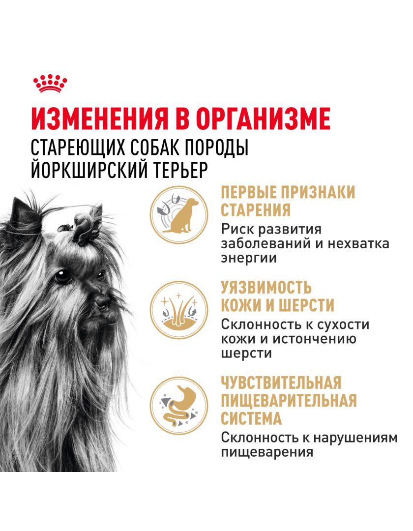 Корм сухой полнорационный для стареющих собак породы Йоркширский терьер старше 8 лет YORKSHIRE TERRIER ADULT 8+ YEARS (ЙОРКШИРСКИЙ ТЕРЬЕР ЭДАЛТ 8+ ЛЕТ) ROYAL CANIN®, подходящий для собак породы йоркширский терьер в возрасте от 8 лет, специально разработан с учетом потребностей вашей собаки в питательных веществах.
