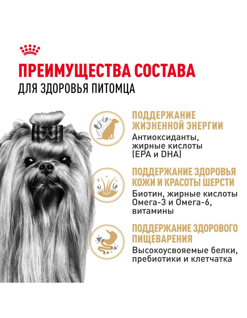 ROYAL CANIN® Yorkshire Terrier Adult 8+ years (ЙОРКШИРСКИЙ ТЕРЬЕР ЭДАЛТ 8+ ЛЕТ) поддерживает здоровье кожи и красоту шерсти вашей собаки благодаря сбалансированному составу, обогащенному жирными кислотами Омега-3 (EPA и DHA), Омега-6, маслом огуречника и биотином.