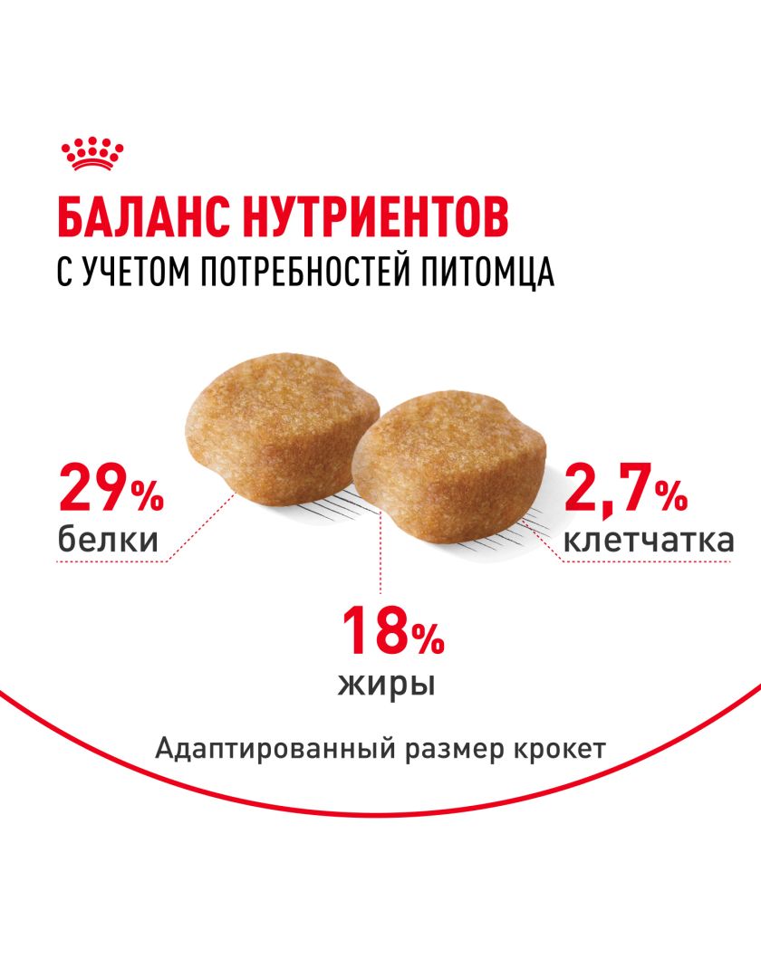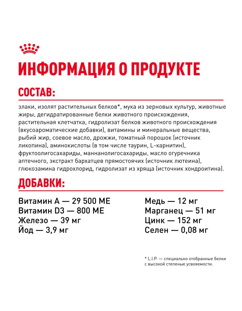 ИНГРЕДИЕНТЫ: злаки, изолят растительных белков*, мука из зерновых культур, животные жиры, дегидратированные белки животного происхождения (птица), растительная клетчатка, гидролизат белков животного происхождения (вкусоароматические добавки), витамины и минеральные вещества, рыбий жир, соевое масло, дрожжи, томатный порошок (источник ликопина), аминокислоты (в том числе таурин, L-карнитин), фруктоолигосахариды, маннанолигосахариды, масло огуречника аптечного, экстракт бархатцев прямостоячих (источник лютеина), глюкозамина гидрохлорид, гидролизат из хряща (источник хондроитина).