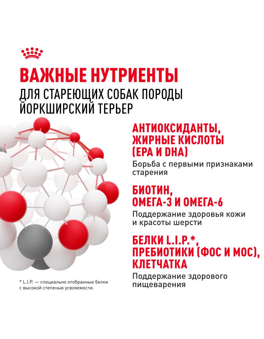 ROYAL CANIN® Yorkshire Terrier Adult 8+ years (ЙОРКШИРСКИЙ ТЕРЬЕР ЭДАЛТ 8+ ЛЕТ) содержит жирные кислоты Омега-3 (EPA и DHA и комплекс антиоксидантов) для поддержания здоровья и жизненной энергии собак в годы старения.