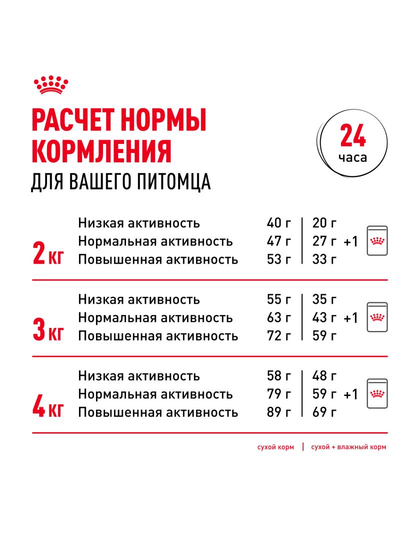 см. таблицу. Корм готов к употреблению. Проследите, чтобы у вашей собаки всегда была свежая вода. Номер серии и срок годности указаны на упаковке.