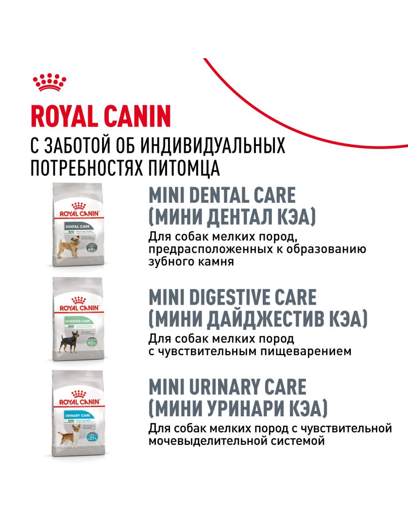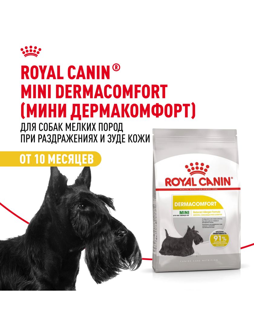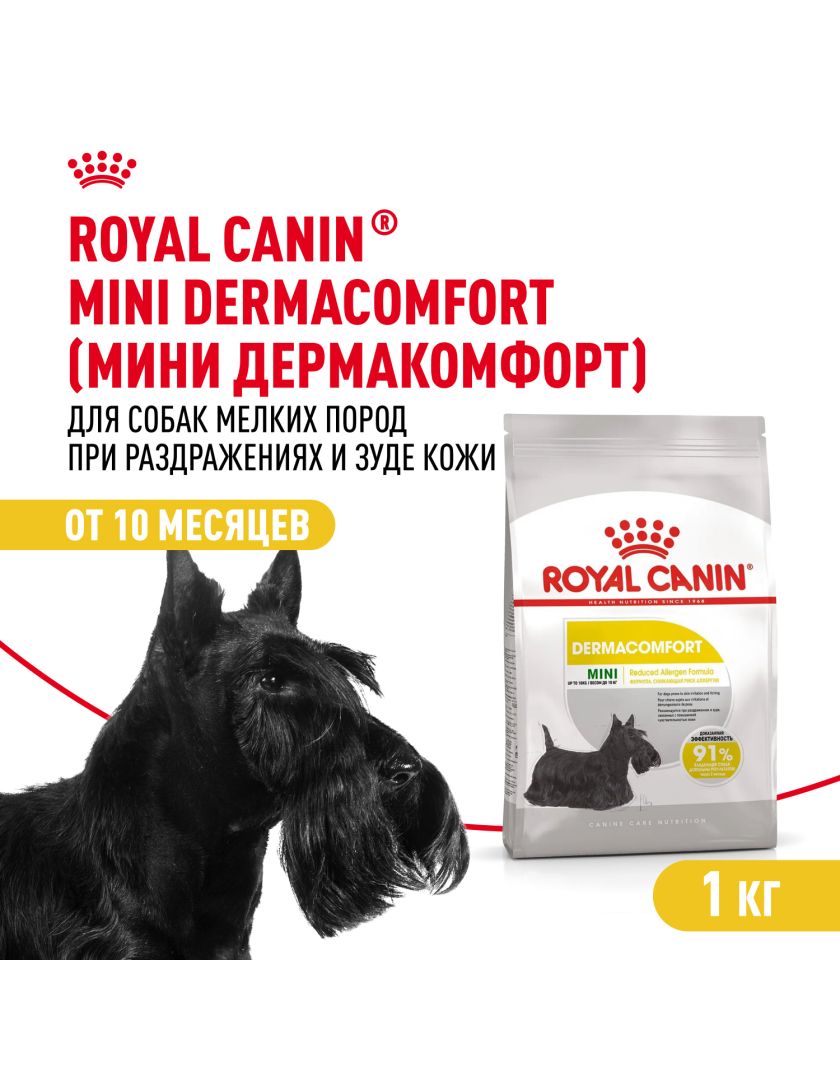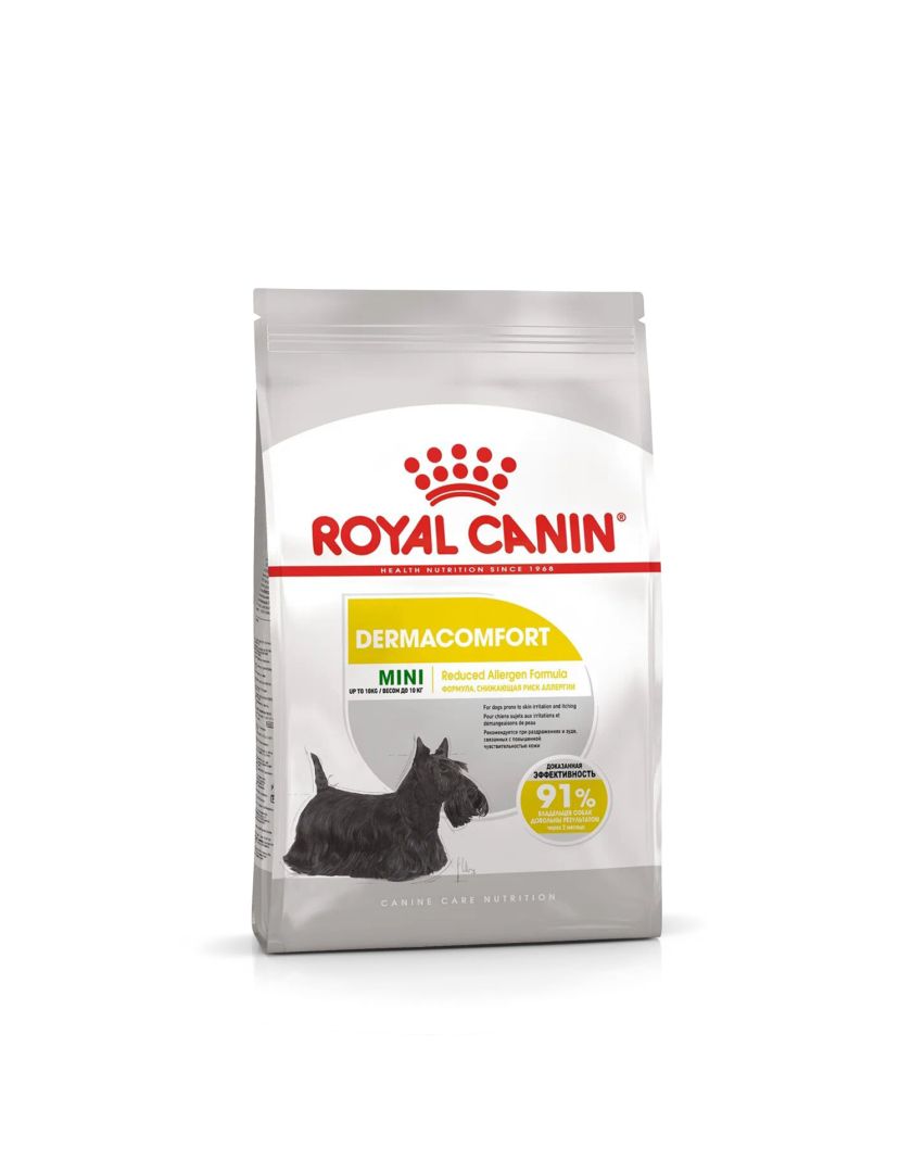 Корм сухой полнорационный для взрослых и стареющих собак мелких размеров (весом от 1 до 10 кг) в возрасте 10 месяцев и старше, при раздражениях и зуде кожи, связанных с повышенной чувствительностью MINI DERMACOMFORT (МИНИ ДЕРМАКОМФОРТ) ROYAL CANIN®, подходящий для собак мелких размеров с чувствительной кожей в возрасте от 10 месяцев до 8 лет, специально разработан с учетом потребностей вашей собаки в питательных веществах.