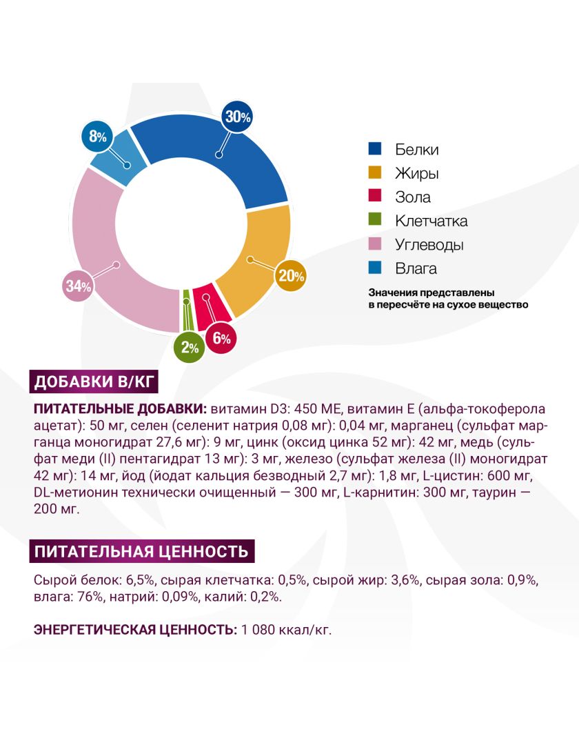 Состав Куриная печень 20%, мясо свинины, картофель, сухое яйцо 4%, тапиока, животный жир (свиной жир очищенный на 99,5%), рыбий жир (лососевое масло очищенное на 99,5%), минеральные вещества, гидролизованный животный белок, гидролизованные дрожжи 1% (из которых свободные нуклеотиды мин.44%), семена подорожника (0,5%), ксилоолигосахариды 0,4%, волокна гороха, сушёный конский каштан (0,06%). Легко усваиваемые ингредиенты: куриная печень и яйцо. Источник гелеобразующих веществ: семена подорожника.