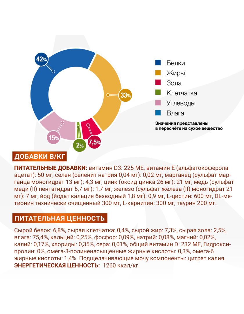 Питательная ценность: сырой белок 6,8%, сырая клетчатка 0,4%, сырой жир 7,3%, сырая зола 2,5%, влага 75,4%, кальций 0,25%, фосфор 0,09%, натрий 0,08%, магний 0,02%, калий 0,17%, хлориды 0,35%, сера 0,01%, общий витамин D 232 МЕ, Гидроксипролин 0%, омега-3 жирные кислоты 0,3%, омега-6 жирные кислоты 1,4%. Подщелачивающие мочу компоненты: цитрат калия.