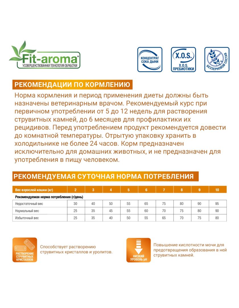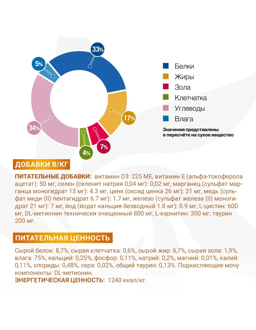 Питательная ценность: сырой белок 8,7%, сырая клетчатка 0,6%, сырой жир 6,7%, сырая зола 1,9%, влага 75%, кальций 0,25%, фосфор 0,11%, натрий 0,2%, магний 0,01%, калий 0,11%, хлориды 0,48%, сера 0,02%, общий таурин 0,13%. Подкисляющие мочу компоненты: DL-метионин.