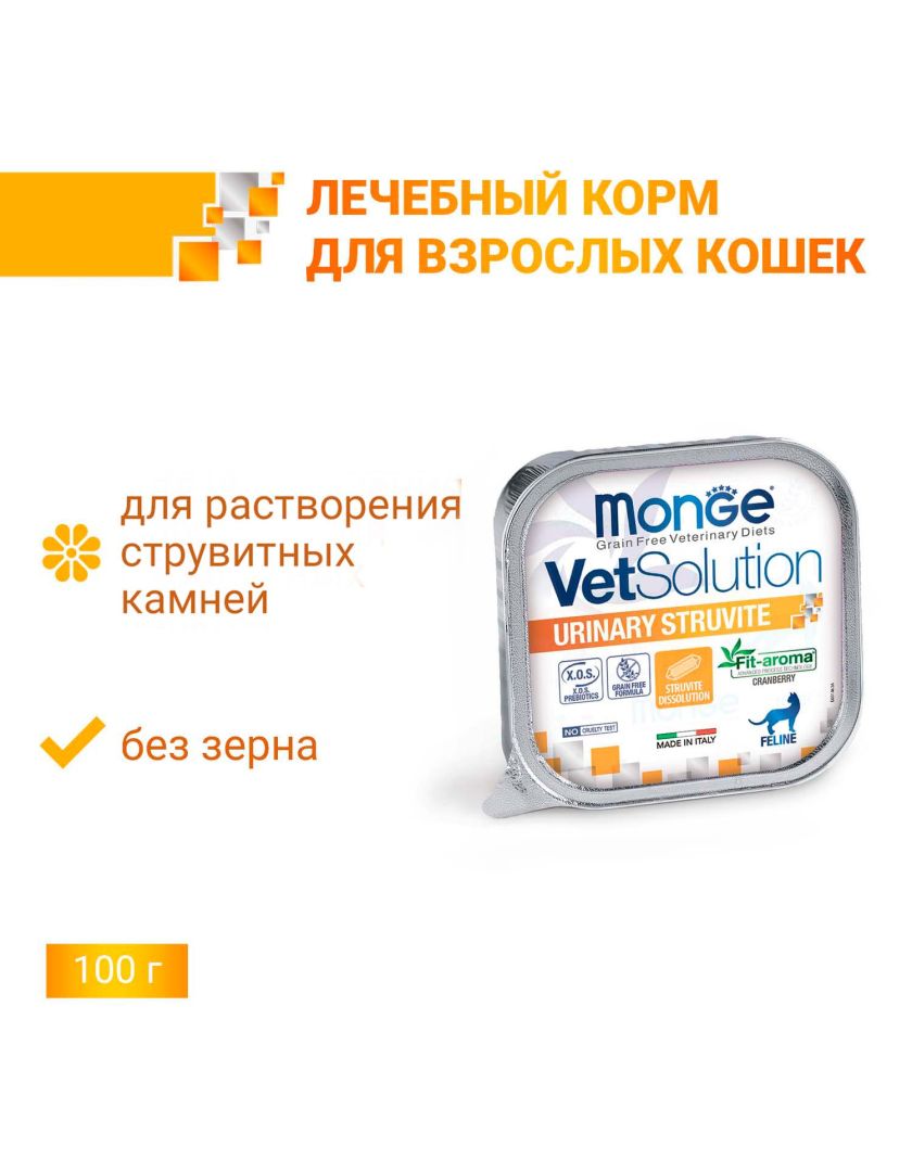 Лечебный корм Monge VetSolution Cat Urinary Struvite Уринари Струвит для кошек при заболеваниях мочеполовой системы, таких как идиопатический цистит (синдром болезненного мочевого пузыря, интерстициальный цистит) и струвитное течение мочекаменной болезни (струвитная кристаллурия и уролитиаз) 100 г.