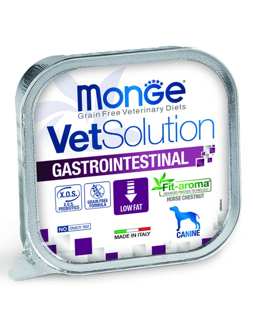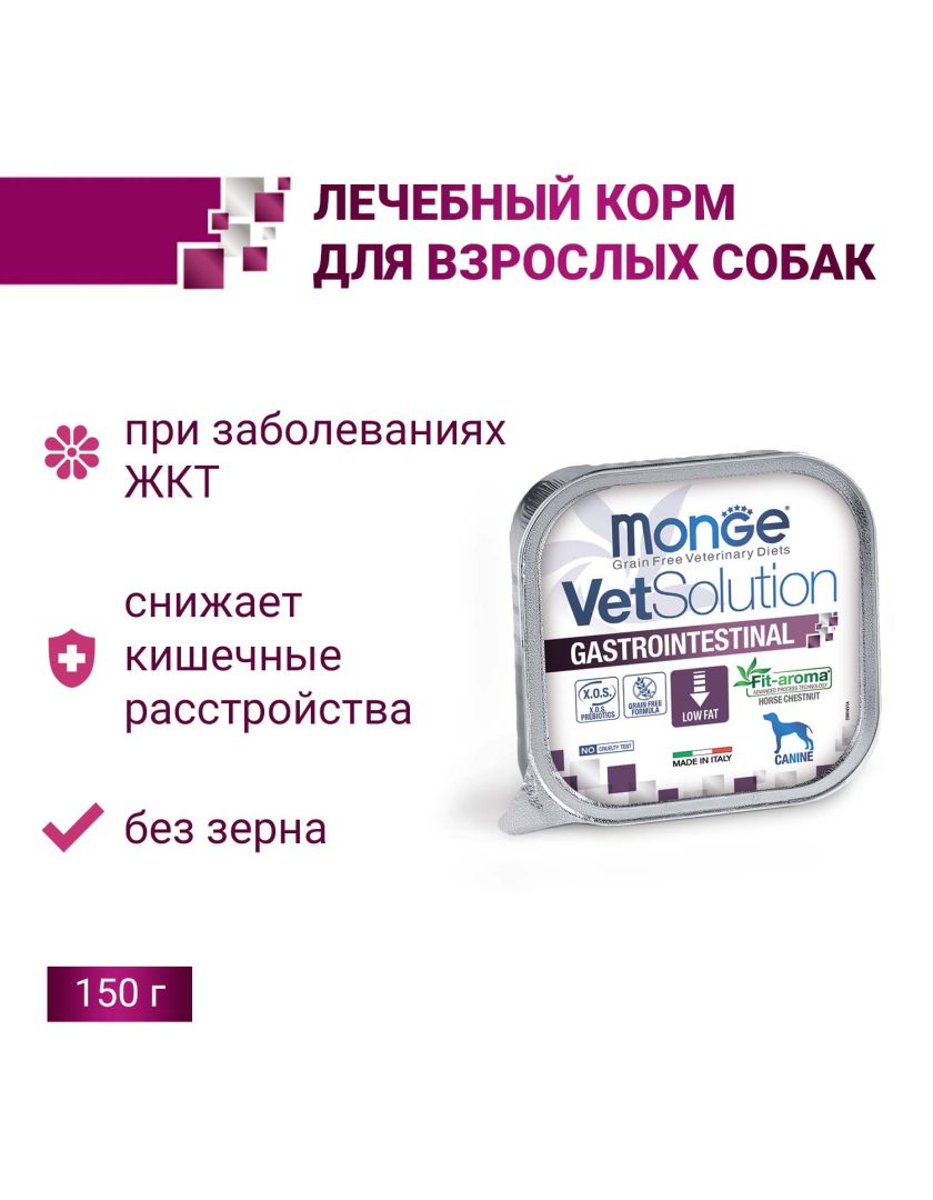 Лечебный корм Monge VetSolution Dog Gastrointestinal Гастроинтестинал для собак при заболеваниях желудочно-кишечного тракта, таких как острый и хронический гастрит, расстройства моторики желудка энтерит и воспалительные заболевания кишечника, энтеропатии с потерей белка, синдром короткой кишки и избыточный бактериальный рост в тонком отделе кишечника, колит, а так же при остром и хроническом панкреатите (для собак, НЕ страдающих ожирением и гипертриглицеридемией) 150 г.