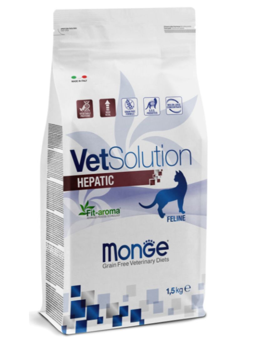 Лечебный корм Monge (Монж) VetSolution Cat Hepatic для кошек Гепатик при заболеваниях печени, таких как печеночная недостаточность, хронический гепатит, фиброз печени, нарушение метаболизма меди, печеночная энцефалопатия, пироплазмоз и желтуха 1,5 кг.