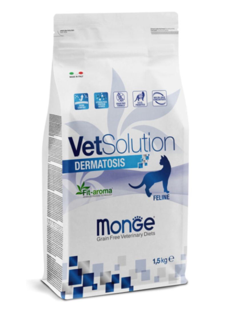 Лечебный корм Monge (Монж) VetSolution Cat Dermatosis для кошек при заболеваниях кожи таких как дерматит, хронический зуд, заболевания кожи, сопровождающиеся воспалением при пищевой аллергии и пищевой непереносимости 1,5 кг.