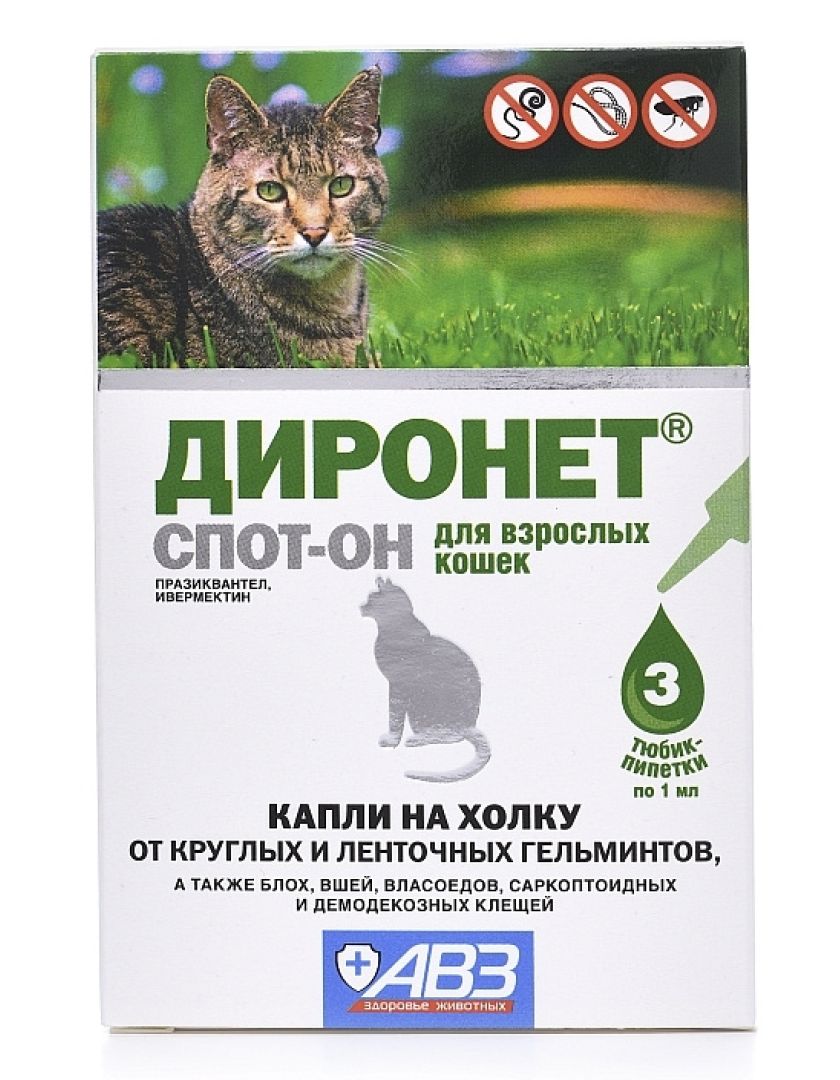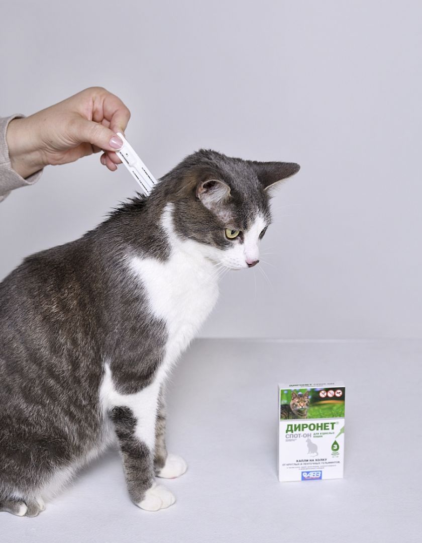 Капли для кошек Диронет Спот-Он против круглых и ленточных гельминтов, клещей, блох, вшей, власоедов
