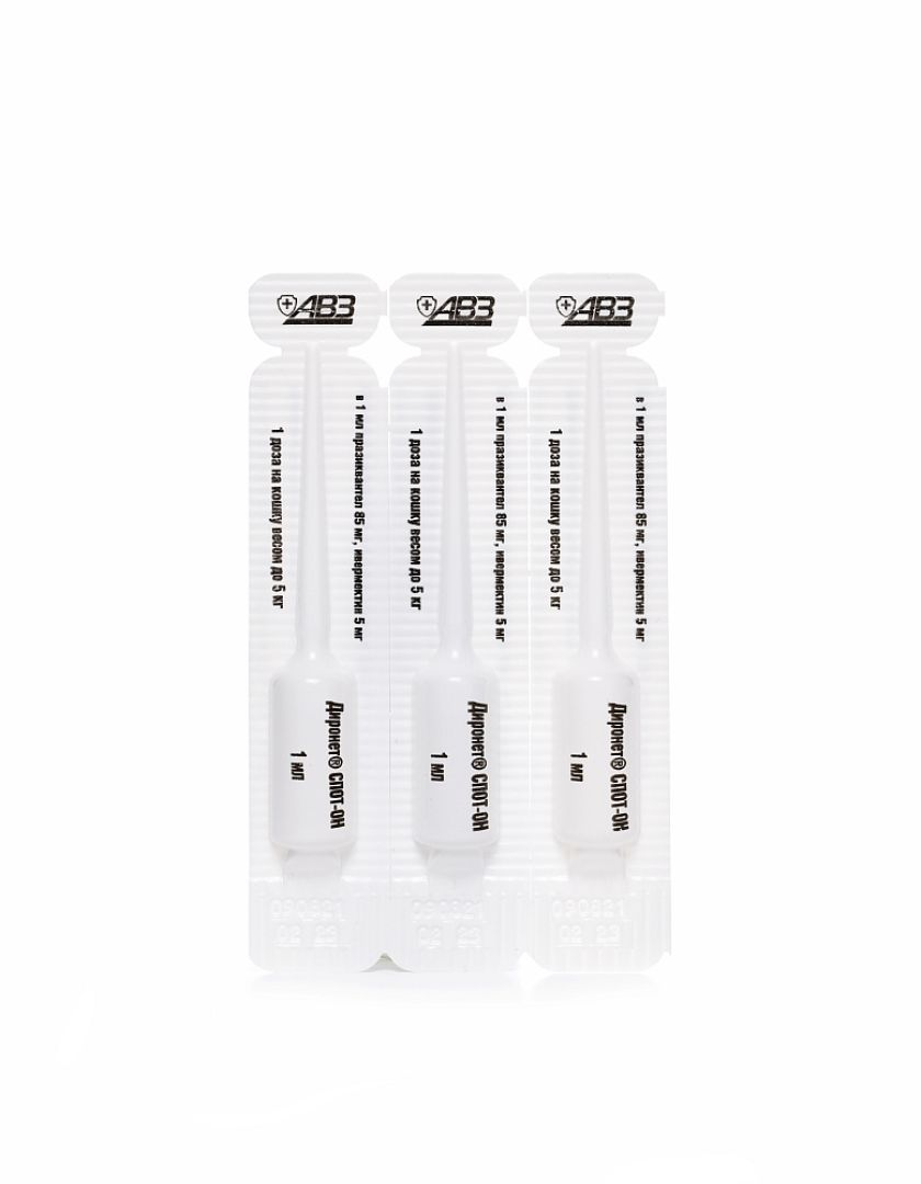 Дозы и способ применения: Диронет спот-он наносят только на сухую неповрежденную кожу животного в дозах: Вес кошки 2 – 5 кг: 1 пипетка. Вес кошки более 5 кг: 2 пипетки. Перед использованием у пипетки отламывают (или срезают) кончик и далее, раздвинув шерсть животного, наносят препарат в нескольких точках, недоступных для слизывания (у основания черепа, между лопатками, вдоль спины). При поражении животного насекомыми (блохи, вши и власоеды) обработку проводят однократно. С профилактической целью процедуру следует проводить не чаще одного раза в месяц, для предотвращения повторной инфестации рекомендуется обработать место содержания и подстилку животного инсекто-акарицидным спреем в соответствии с инструкцией по применению. Для профилактики саркоптоза и нотоэдроза Барс спот-он наносят 2 – 4 раза с интервалом 10 – 14 дней. При отодектозе (ушной чесотке) обработку проводят однократно, при необходимости повторно через 5 – 10 дней в сочетании с гигиенической очисткой ушной раковины и наружного слухового прохода от засохших корочек экссудата и струпьев. В запущенных случаях отодектоза, осложненных отитами, назначают антибактериальные и противовоспалительные средства. При нематодозах и цестодозах с лечебной целью препарат наносят однократно. Максимальный терапевтический эффект наблюдается на 4 – 5 сутки после применения. С профилактической целью дегельминтизацию проводят раз в квартал. Побочные действия: В редких случаях при повышенной индивидуальной чувствительности животного к компонентам препарата и передозировке могут наблюдаться мышечная дрожь, рвота, обильное слюно- и слезотечение, кожный зуд, раздражение и покраснение кожи. При появлении указанных признаков или других проявлениях непереносимости, препарат следует немедленно смыть водой с мылом или шампунем. Противопоказания: Индивидуальная повышенная чувствительность к компонентам препарата. Не подлежат обработке беременные и кормящие кошки, а также больные инфекционными болезнями и выздоравливающие животные. Препарат не следует назначать одновременно с другими противопаразитарными средствами во избежание усиления токсических свойств и кумуляции. Особые указания: При проведении манипуляций с препаратом следует пользоваться резиновыми перчатками, особенно в случае наличия на руках ссадин и других повреждений кожи. Во время обработки запрещается пить, курить и принимать пищу. Не следует гладить и купать животное, подпускать его к маленьким детям в течение 24 часов после применения. При попадании средства на кожу или слизистые оболочки его тотчас необходимо смыть струей воды или снять тампоном и затем отмыть водой. Избегать попадания препарата в ротовую полость, при его случайном заглатывании следует немедленно обратиться к врачу. По окончании обработки руки следует тщательно вымыть теплой водой с мылом.
