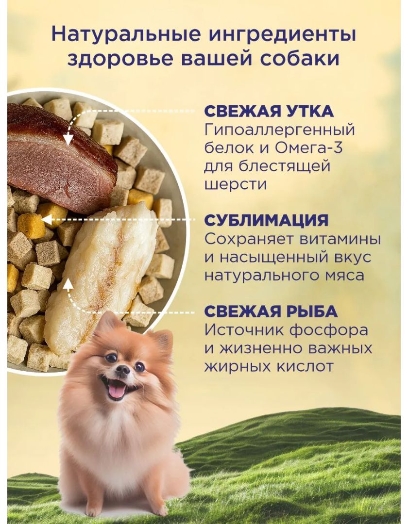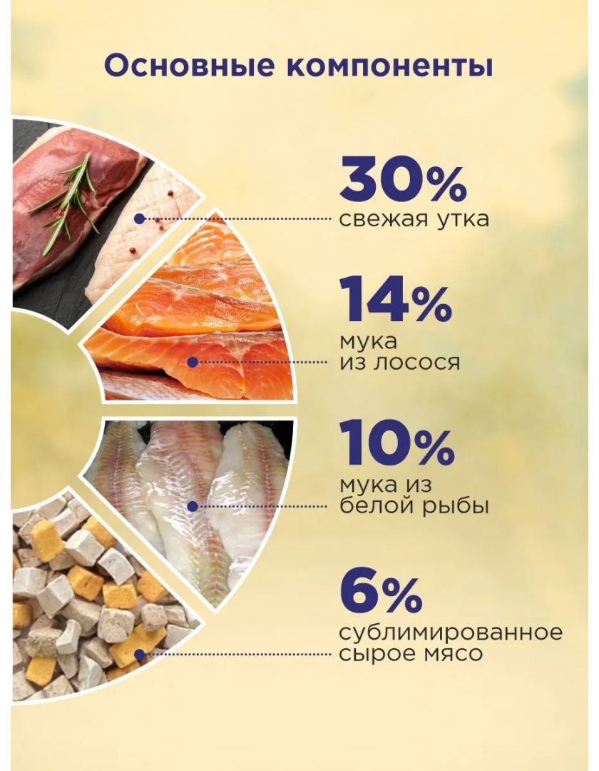Свежая утка 30%, мука из лосося 14%, мука из белой рыбы 10%, высушенная на воздухе утка 10%, картофель, утиный жир, сублимированное сырое мясо 6% (утка 2%, утиная печень 2%, утиный яичный желток 2%), сладкий картофель, яблоко 3%, гидролизованная утка печень, лососевый жир, льняное семя, чечевица, морковь, тыква, черника, клюква, помидоры, маннонолигосахариды, фруктоолигосахариды, витамин А, витамин D3, витамин Е, нитрат тиамина, рибофлавин, пиридоксина гидрохлорид, цианокобаламин, ниацин, пантотенат d-кальция, протеинат железа, протеинат меди, протеинат марганца, протеинат цинка., йодат кальция, дрожжевой селен, dl-метионин, хлорид холина, хлорид натрия, хлорид калия, сульфат хондроитина, экстракт юкки, экстракт чая, экстракт розмарина, глюкозамин