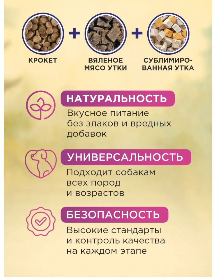 Вкусная комбинация двух видов мяса — утки и лосося — создает исключительную пищевую ценность, насыщенность важными аминокислотами и ненасыщенными жирными кислотами, что способствует поддержанию отличной физической формы и красоты шерсти вашего питомца.