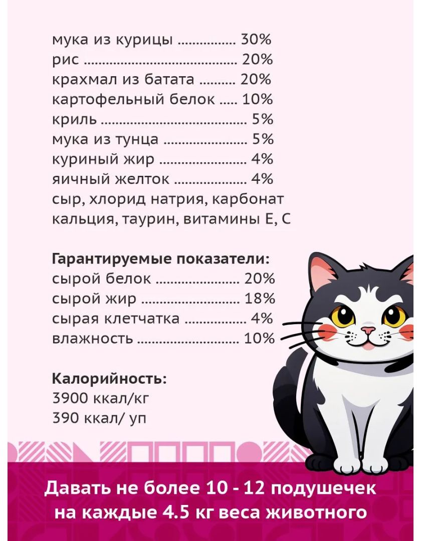 Мука из курицы 30%, рис 20%, крахмал из батата 20%, картофельный белок 10%, криль 5%, мука из тунца 5%, куриный жир 4%, яичный желток 4%, сыр, хлорид натрия, карбонат кальция, таурин, витамин Е, витамин С.
