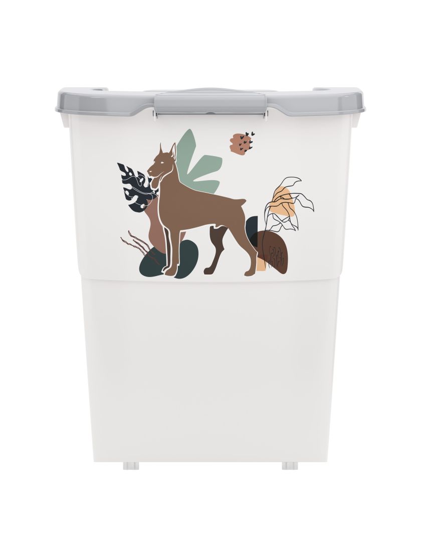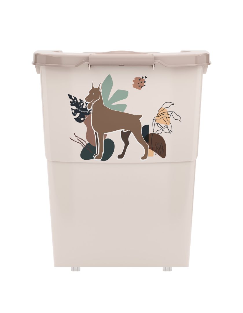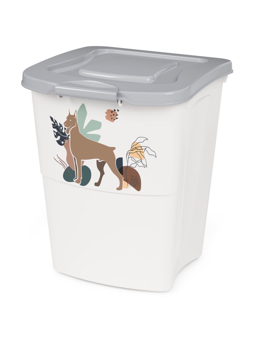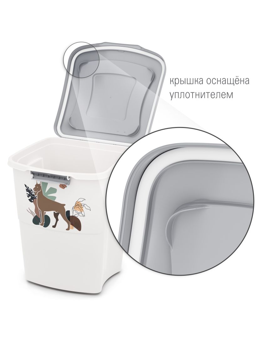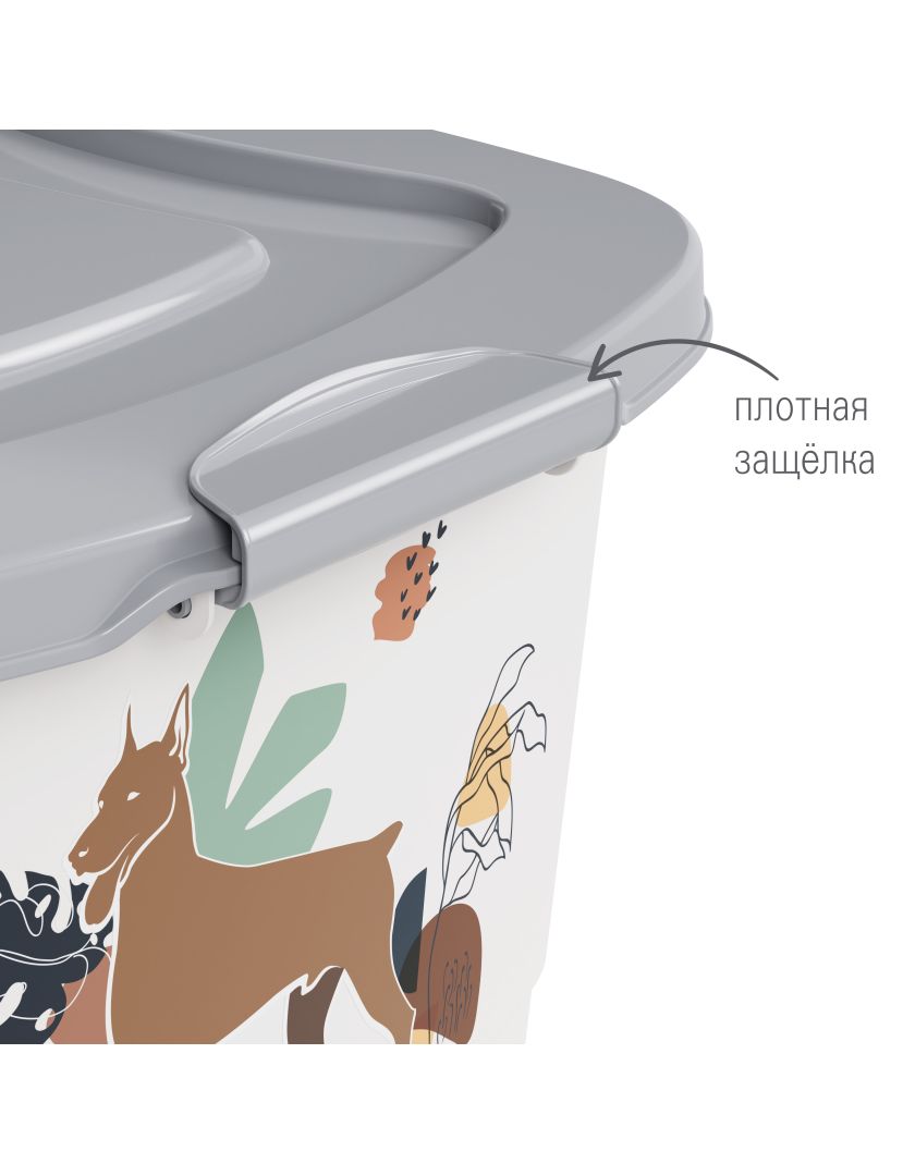 Контейнер вмещает от 14,5 до 16 кг сухого корма в зависимости от плотности корма и размера гранул. Изделие оснащено колесиками для удобства транспортировки и крышкой, которая плотно прилегает к контейнеру за счёт уплотнителя, тем самым обеспечивая герметичность. Хранение корма в специальной таре предотвращает заветривание корма, попадание влаги, сохраняя вкусовые качества продукта. Контейнер выполнен из пищевого высококачественного пластика, отличается особой прочностью и надежностью. Также стоит отметить, что способ хранения сухих кормов в специальной таре обеспечивает порядок и чистоту в доме.