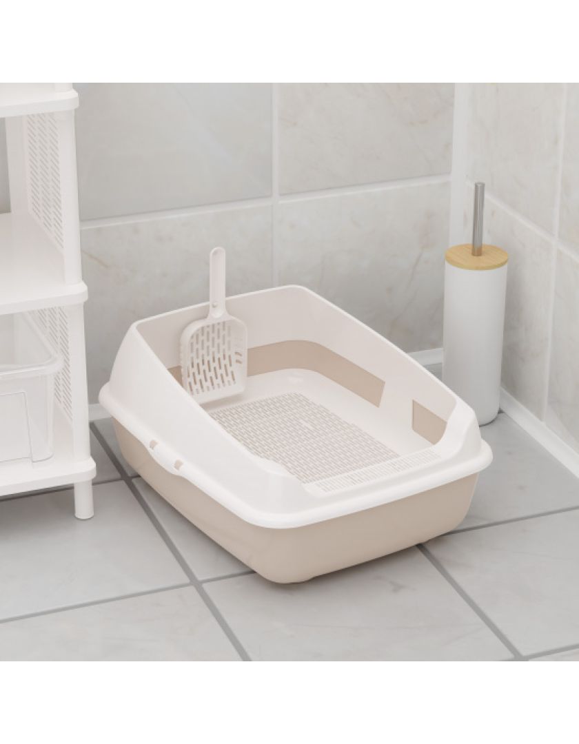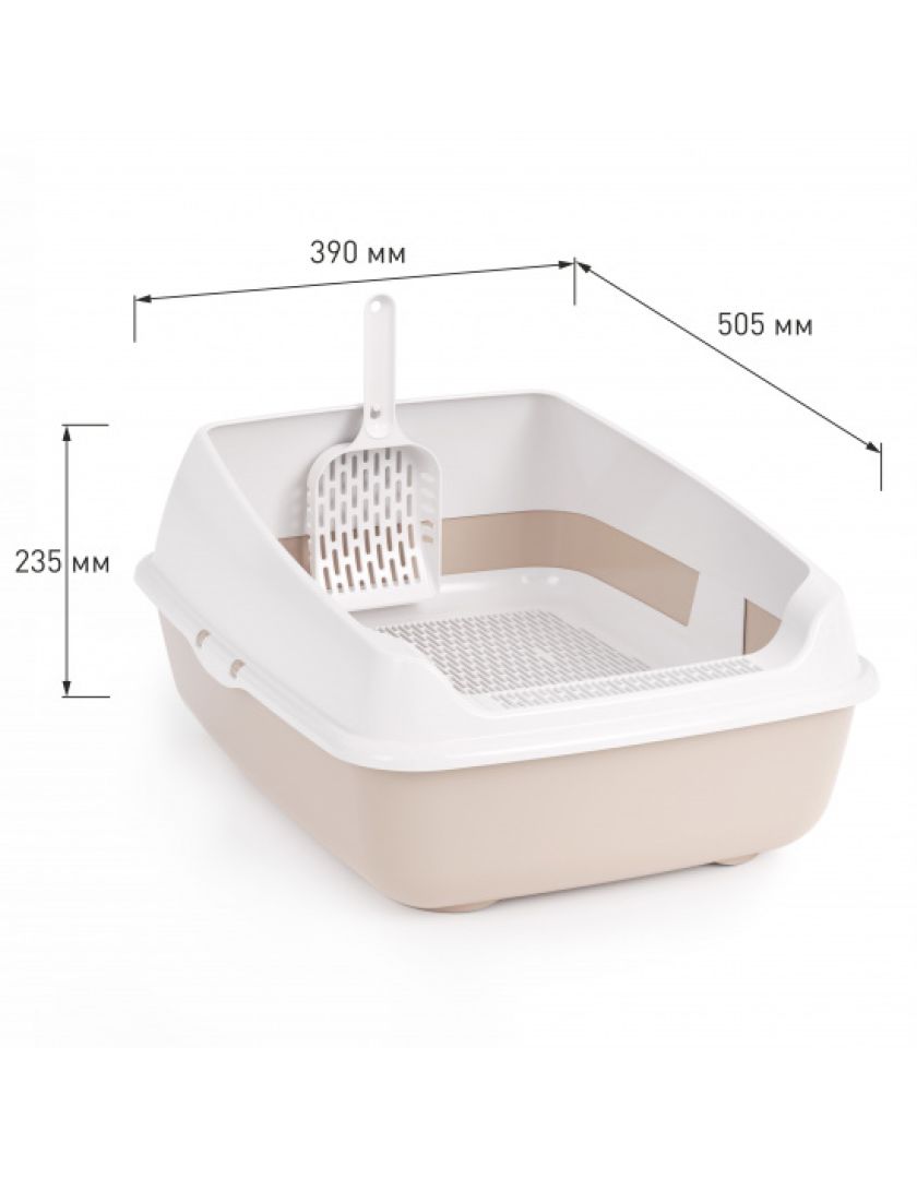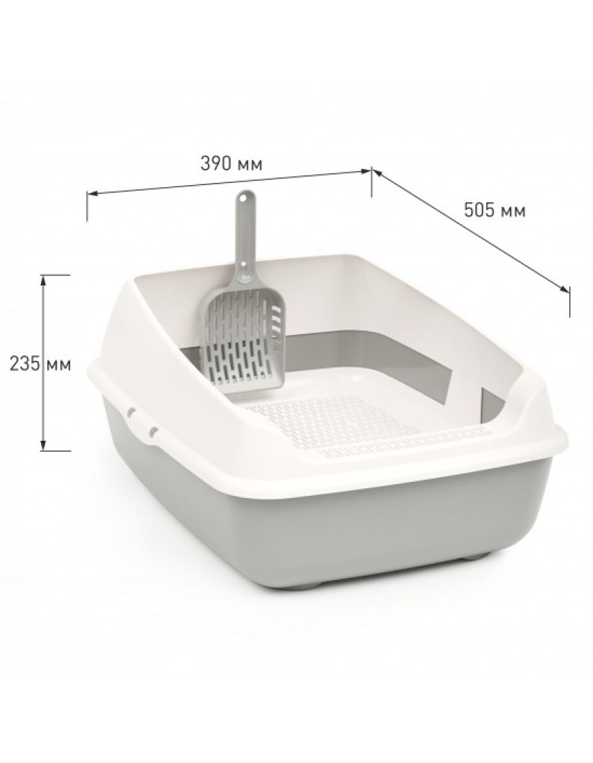 Лоток для кошек с высокими бортами, сеткой и совком изготовлен из прочного пластика, безопасен для здоровья питомца и не имеет посторонних химических запахов.