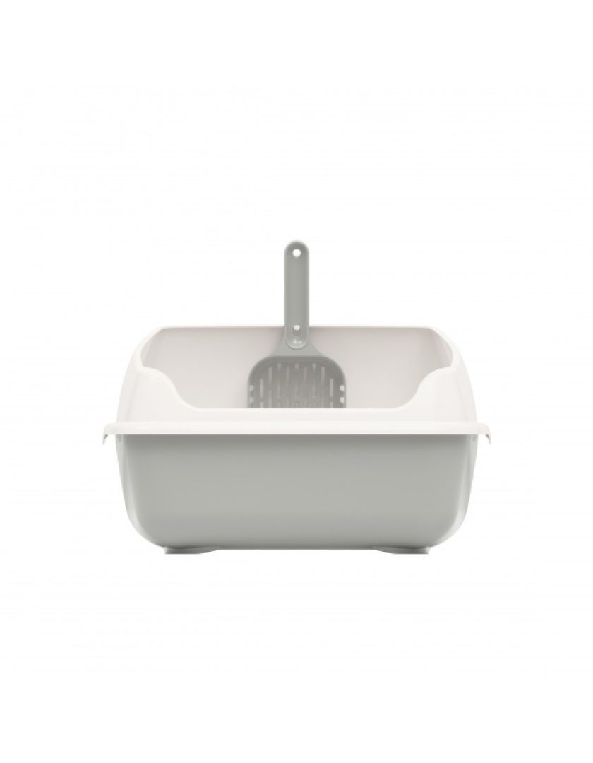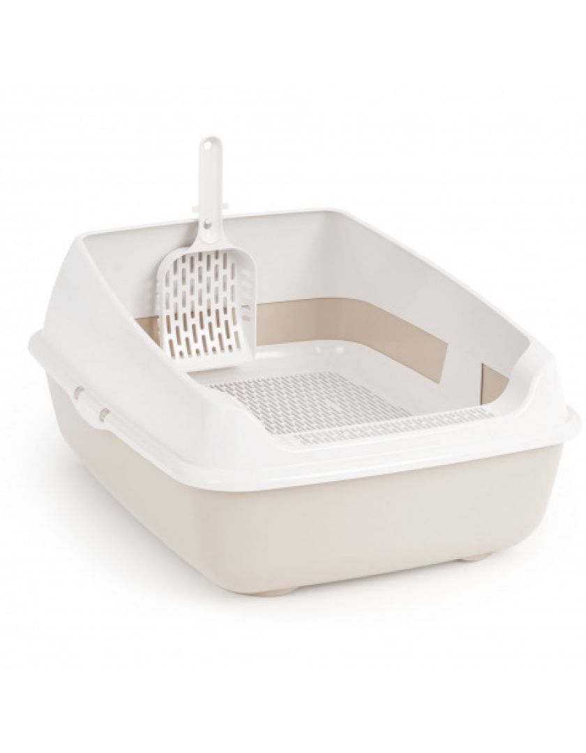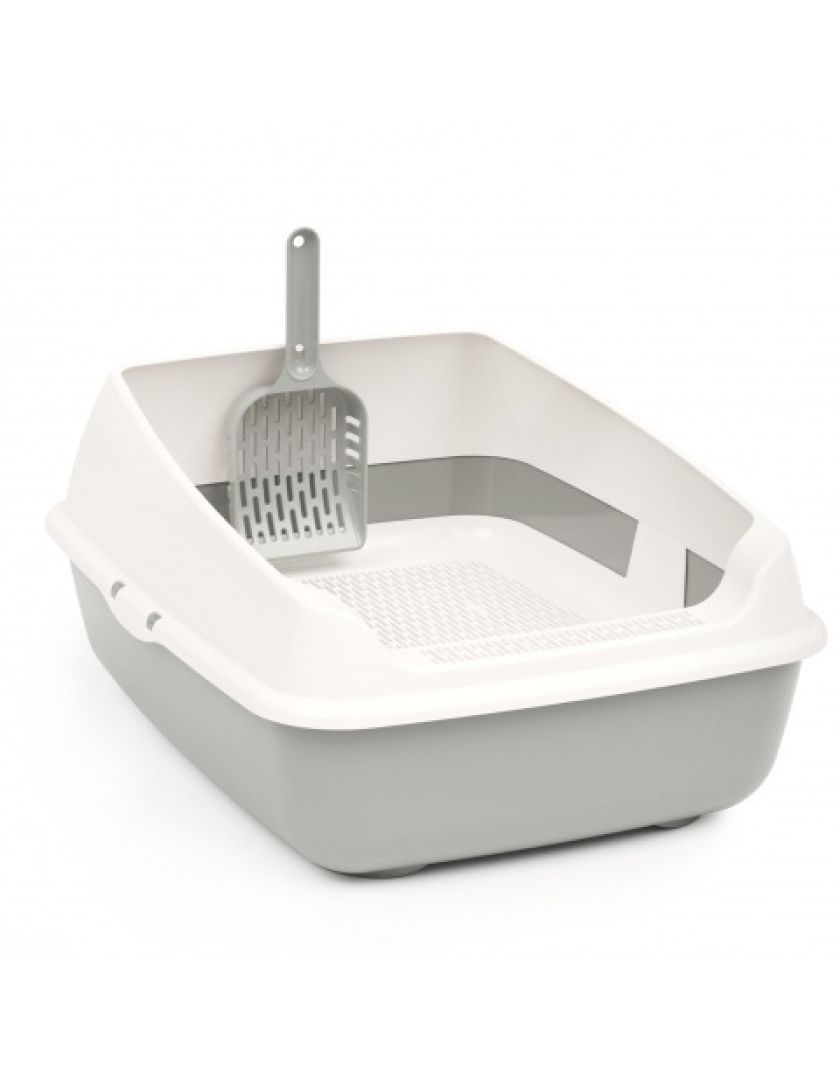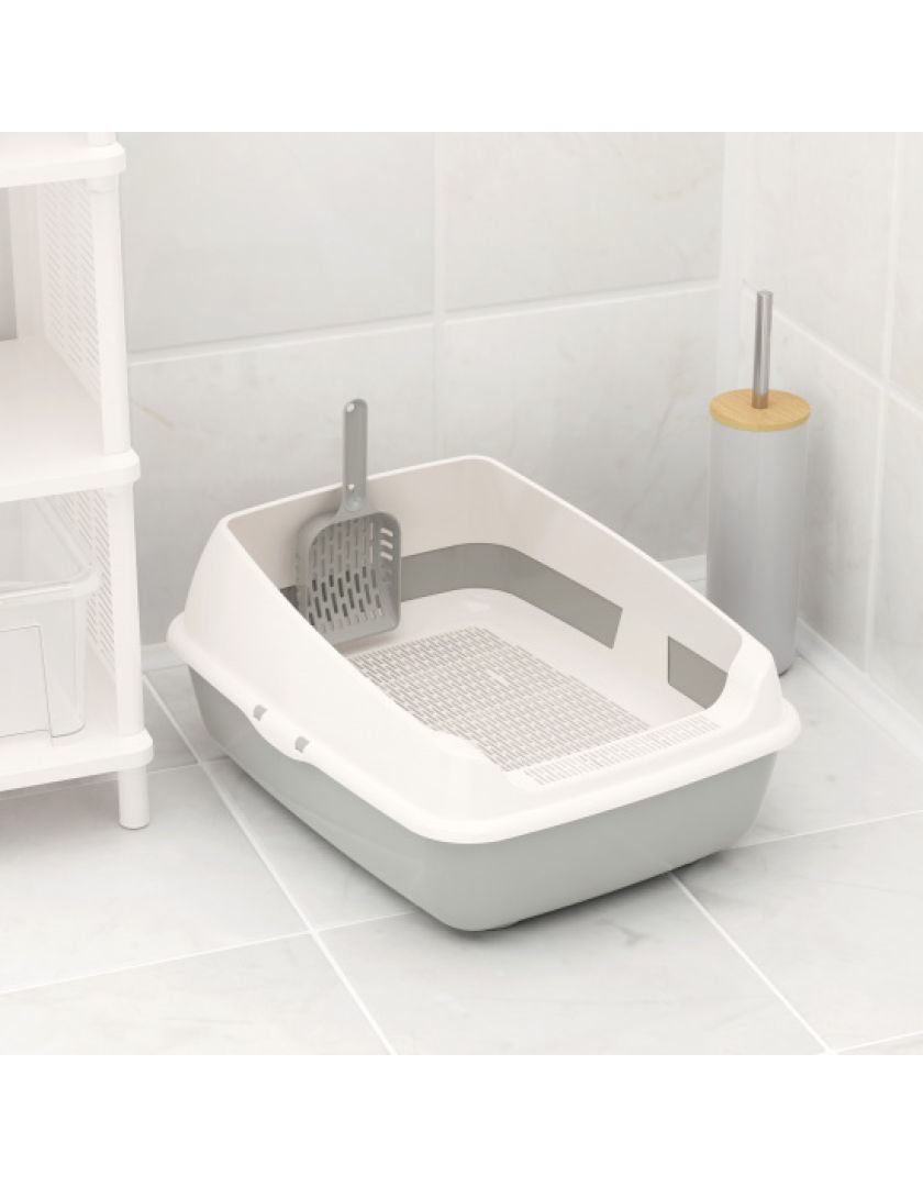 Лоток для кошек с высокими бортами, сеткой и совком изготовлен из прочного пластика, безопасен для здоровья питомца и не имеет посторонних химических запахов.
