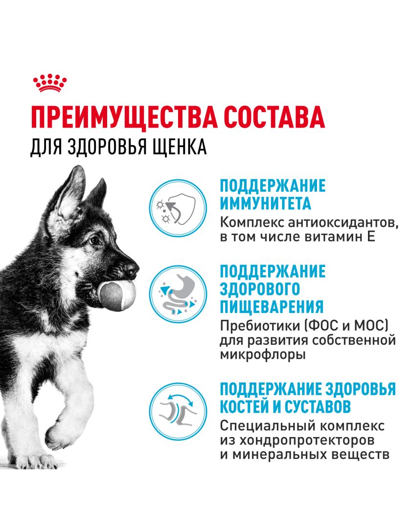Фаза роста – важнейший этап в жизни собаки: это период больших перемен, открытий и новых встреч. В этот ключевой период иммунная система щенка развивается постепенно. Корм German Shepherd Puppy (НЕМЕЦКАЯ ОВЧАРКА ПАППИ) способствует усилению иммунного ответа щенка, в частности, за счет комплекса антиоксидантов, в том числе витамина Е, таурина и лютеина.