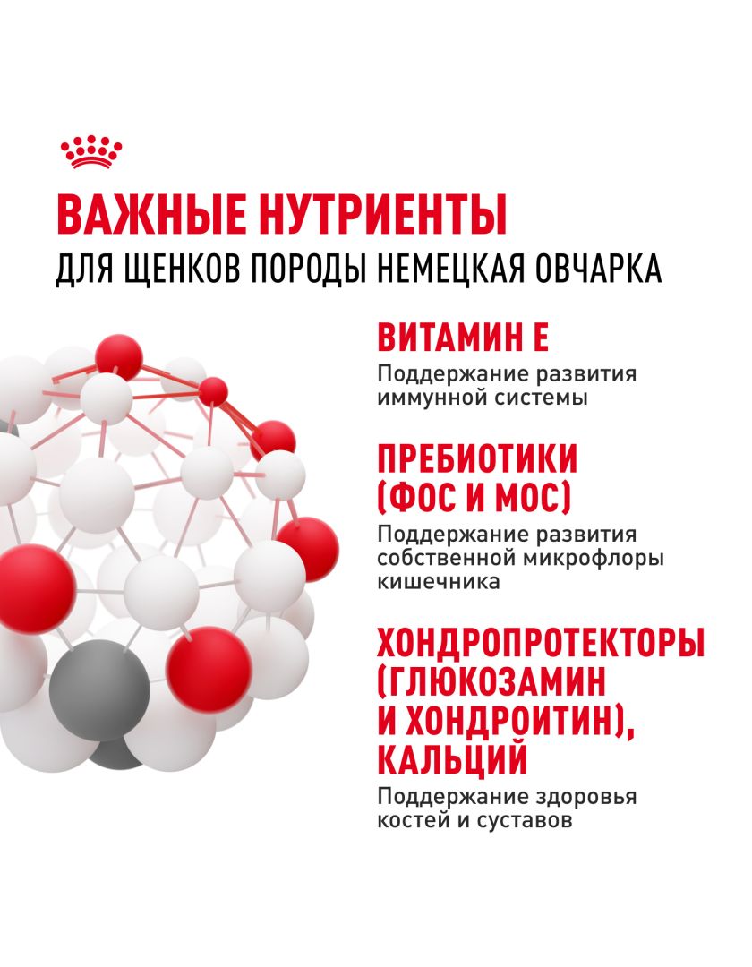 Поскольку иммунная система вашего щенка развивается постепенно, корм ROYAL CANIN® German Shepherd Puppy (НЕМЕЦКАЯ ОВЧАРКА ПАППИ) содержит эффективный комплекс антиоксидантов, комплекс антиоксидантов, включая витамин Е, таурин и лютеин, для поддержания естественной защиты в период формирования его иммунной системы.