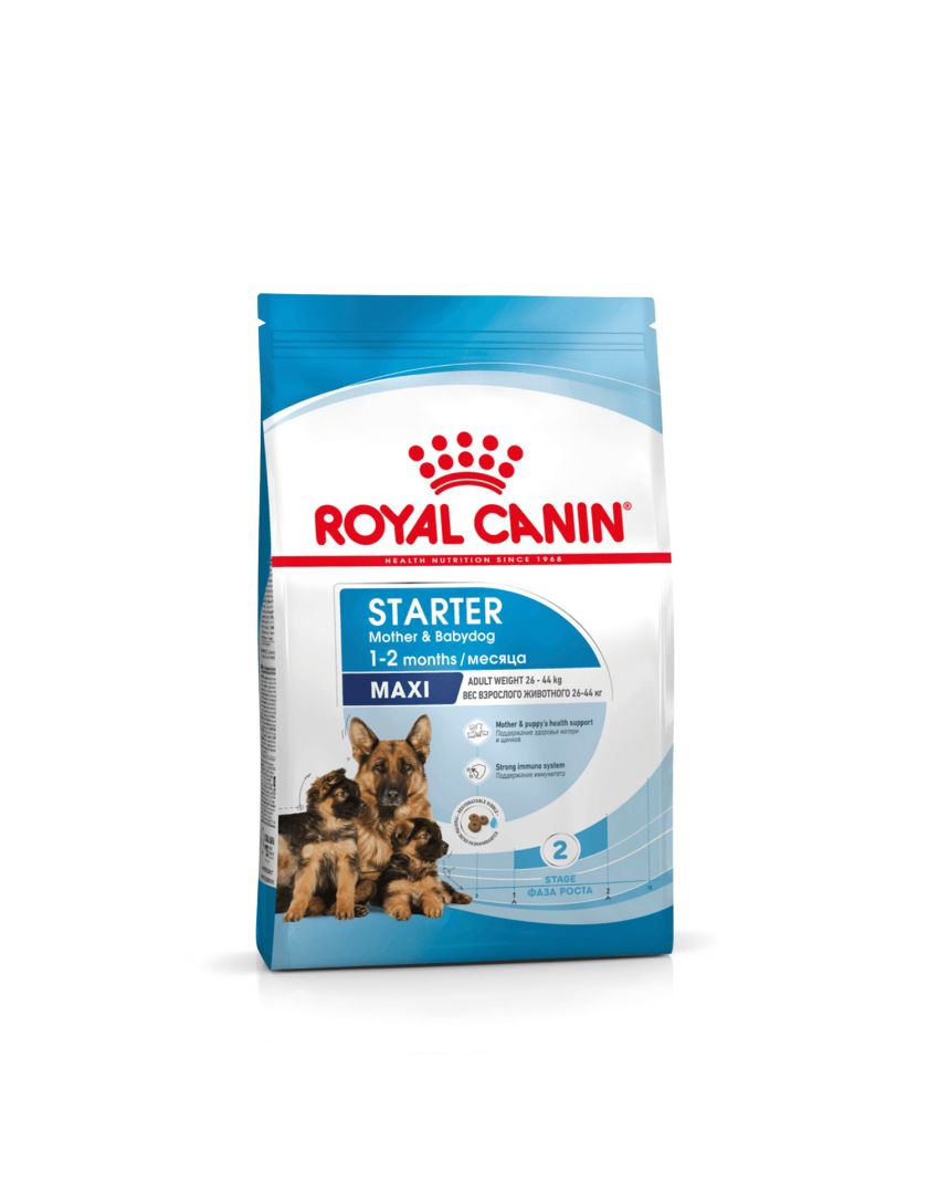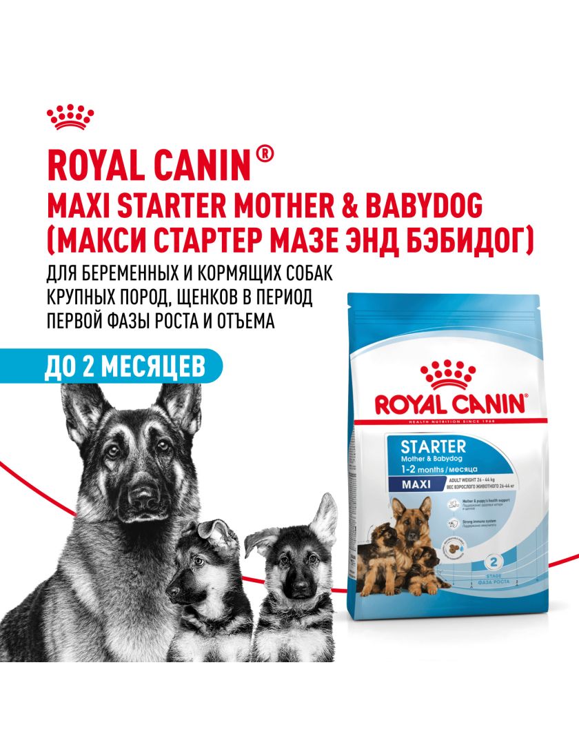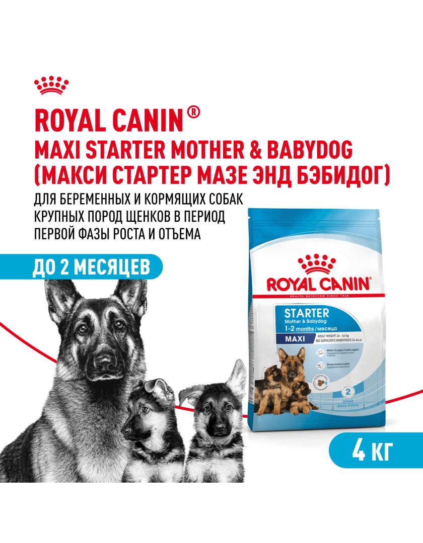 Продукт ROYAL CANIN® Maxi Starter Mother & Babydog (Макси Стартер Мазе Энд Бэбидог) разработан с учетом потребностей в питательных веществах матери и ее новорожденных щенков. Эта формула подходит для взрослых крупных собак в период беременности и лактации весом от 26 до 44 кг, а также для щенков в возрасте до 2 месяцев.