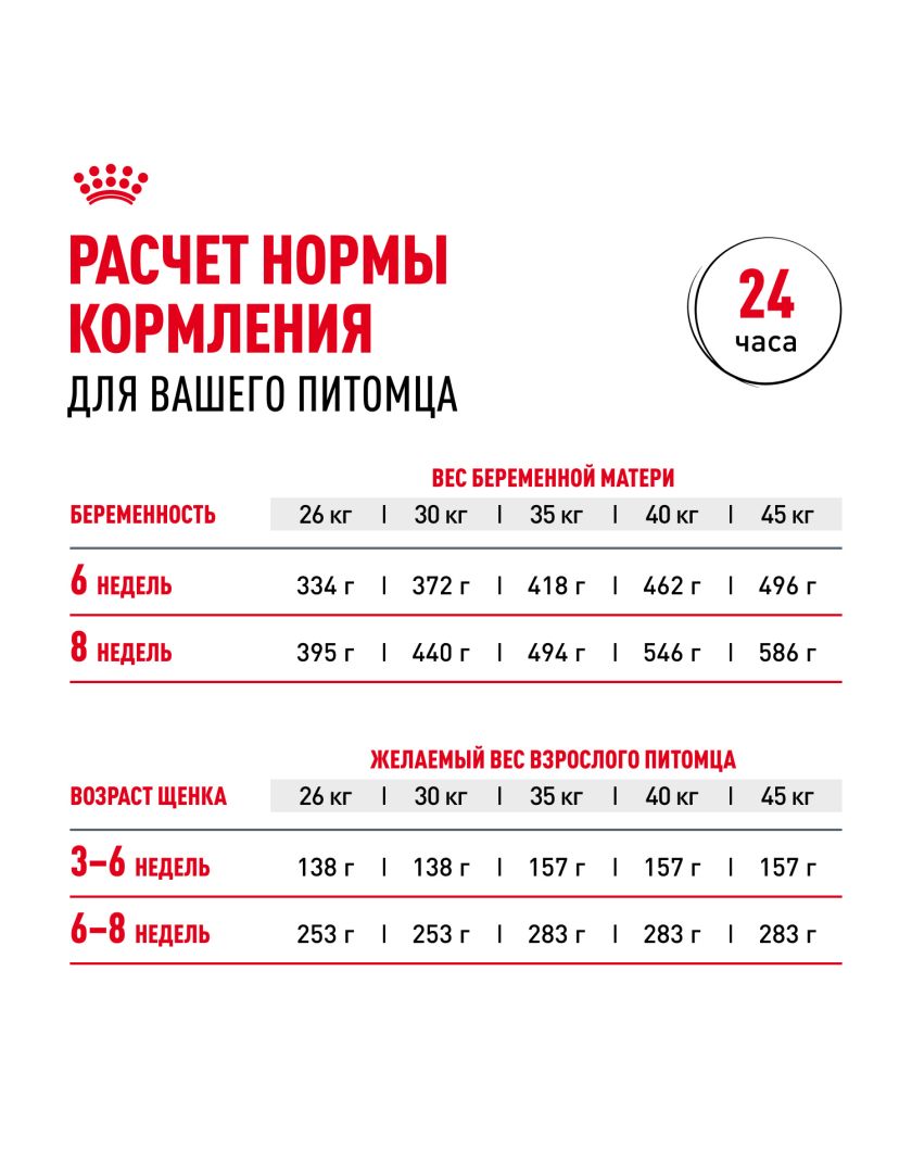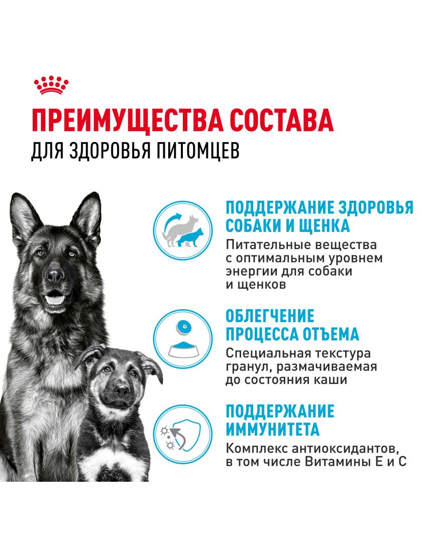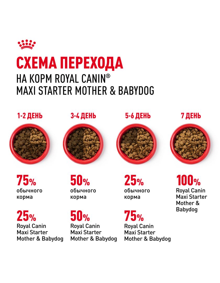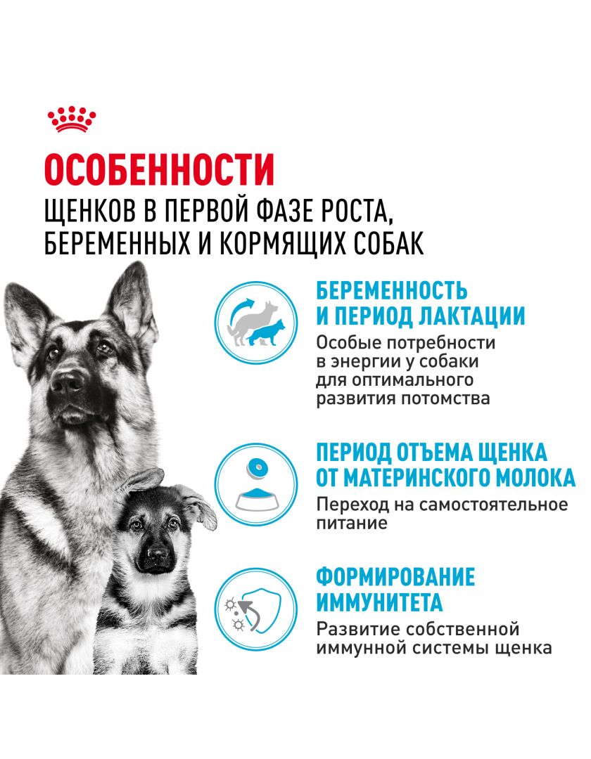 Продукт ROYAL CANIN® Maxi Starter Mother & Babydog (Макси Стартер Мазе Энд Бэбидог) разработан с учетом потребностей в питательных веществах матери и ее новорожденных щенков. Эта формула подходит для взрослых крупных собак в период беременности и лактации весом от 26 до 44 кг, а также для щенков в возрасте до 2 месяцев.