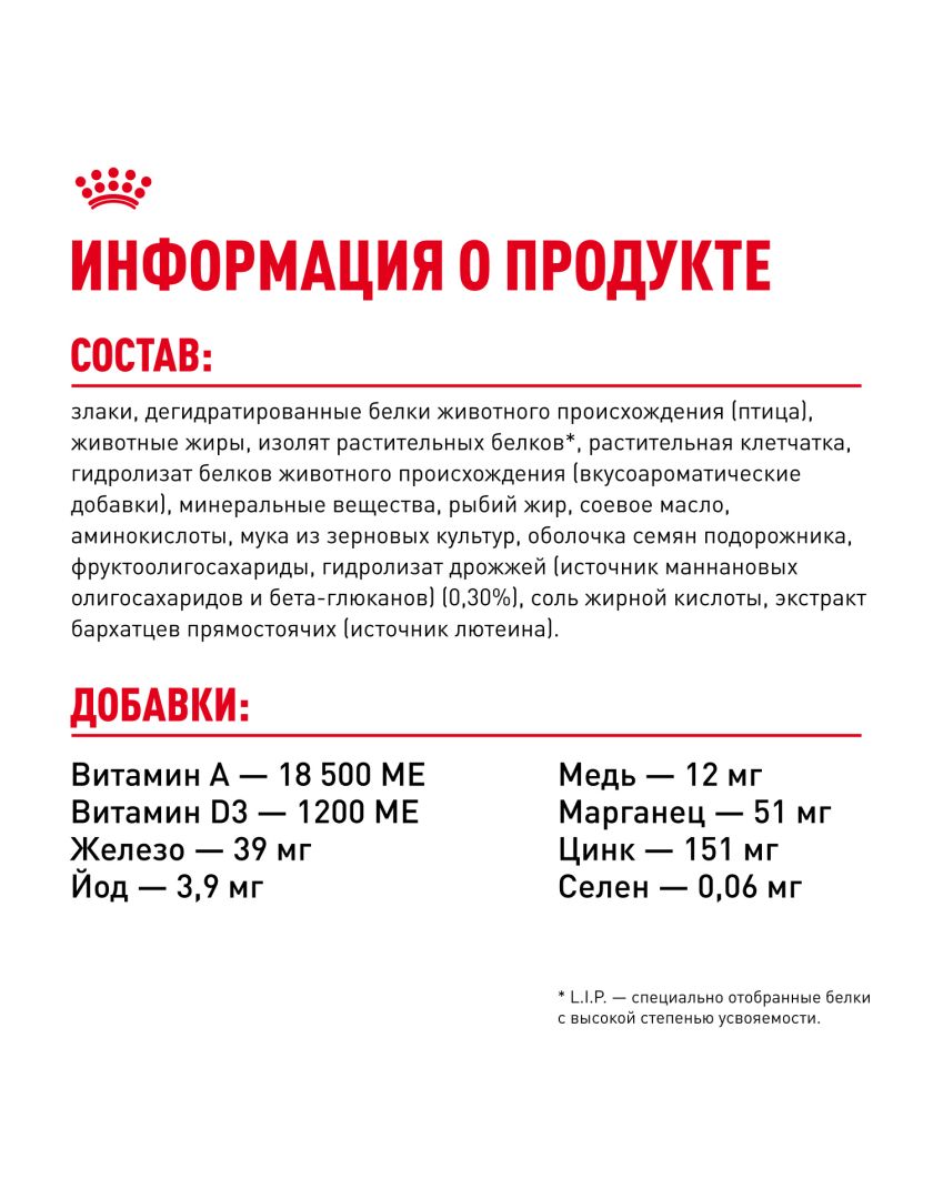 ИНГРЕДИЕНТЫ: злаки, дегидратированные белки животного происхождения (птица), животные жиры, изолят растительных белков*, растительная клетчатка, гидролизат белков животного происхождения (вкусоароматические добавки), минеральные вещества, рыбий жир, соевое масло, аминокислоты, мука из зерновых культур, оболочкa семян подорожника, фруктоолигосахариды, гидролизат дрожжей (источник мaннановых олигосахаридов и бета-глюканов) (0,30 %), соль жирной кислоты, экстракт бархатцев прямостоячих (источник лютеина).