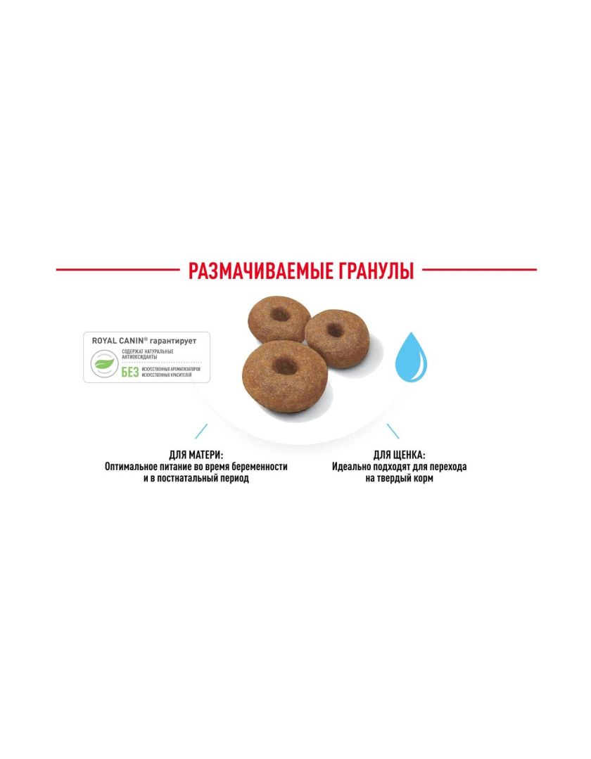Гранулы ROYAL CANIN® Maxi Starter Mother & Babydog (Макси Стартер Мазе Энд Бэбидог) легко размачиваются до консистенции каши и обладают высокой вкусовой привлекательностью для щенков в период отъема.