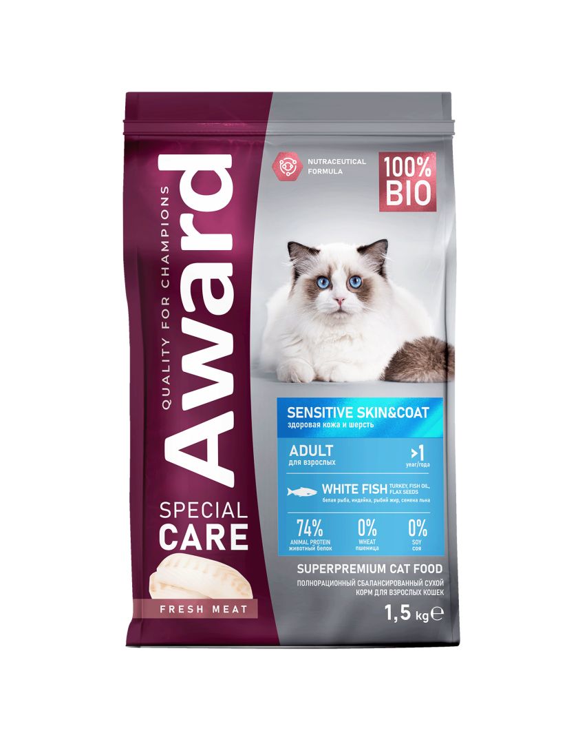 Сухой корм для кошек AWARD SPECIAL CARE Sensitive Skin&Coat для здоровой кожи и шерсти со свежей белой рыбой