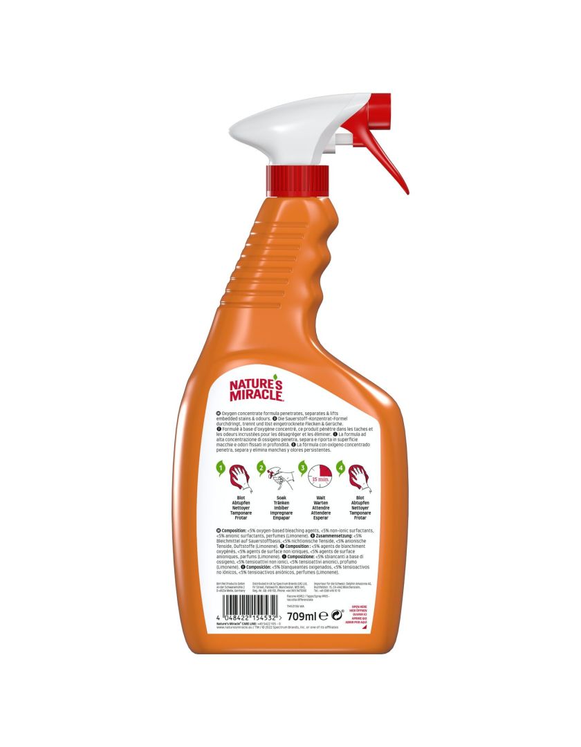 Уничтожитель пятен и запахов Окси-формула для кошек от Nature’s Miracle – идеальный выбор для владельцев животных, желающих быстро избавиться от пятен и запахов. Формула, насыщенная активным кислородом, разрывает связь между загрязнением и поверхностью и способствует его распаду. Окси-формула освежает цвет ковров и мягкой мебели, позволяя им выглядеть новее. Средство великолепно справляется с пятнами и запахами, оставленными кошками и другими животными, на коврах, мебели, твердых поверхностях, тканях, переносках, спальных местах животных и т. д.