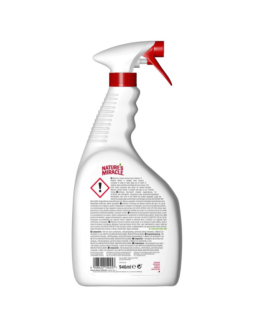 Универсальный уничтожитель пятен и запахов для кошек Nature’s Miracle — идеальное решение для любых загрязнений, оставленных животными. Пятна и запахи от травы, грязи, рвоты, мочи, фекалий и крови – не проблема для биоэнзимной формулы Nature’s Miracle. Универсальный уничтожитель пятен и запахов эффективно устраняет все органические пятна и запахи, оставляя легкий аромат цитруса или дыни (в зависимости от выбранного продукта). Средство можно использовать на коврах, твердых поверхностях, тканях, на переносках и спальных местах животного, оно идеально для пятен и запахов, оставленных кошками и другими животными. Обновлённая формула еще эффективней справляется даже с въевшимися запахами.