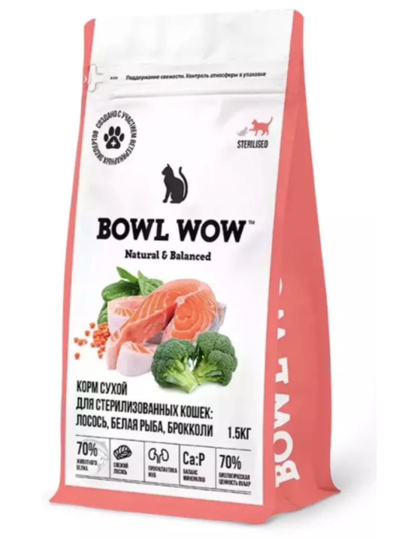 Сухой корм для стерилизованных кошек BOWL WOW с лососем, белой рыбой, брокколи