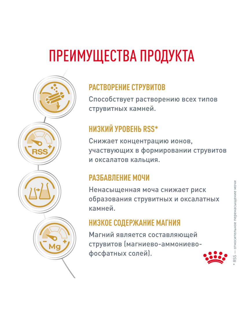 Сухой корм ROYAL CANIN® URINARY S/O (УРИНАРИ С/О) - полноценный диетический корм, способствующий растворению струвитных камней и профилактике рецидивов благодаря подкисляющим мочу свойствам, низкому содержанию магния и ограниченному количеству высококачественных белков. Способствует растворению струвитных камней в мочевыводящих путях