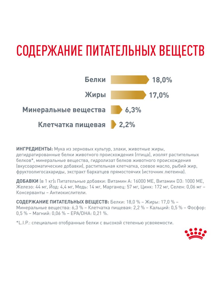ИНГРЕДИЕНТЫ: мука из зерновых культур, злаки, животные жиры, дегидратированные белки животного происхождения (птица), изолят растительных белков*, минеральные вещества, гидролизат белков животного происхождения (вкусоароматические добавки), растительная клетчатка, соевое масло, рыбий жир, фруктоолигосахариды, экстракт бархатцев прямостоячих (источник лютеина).