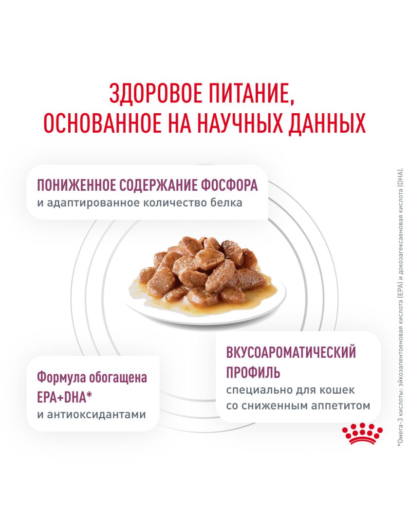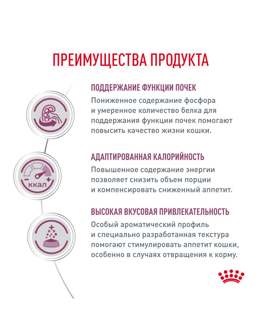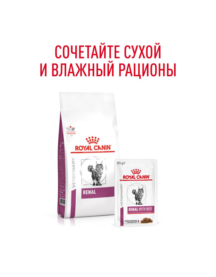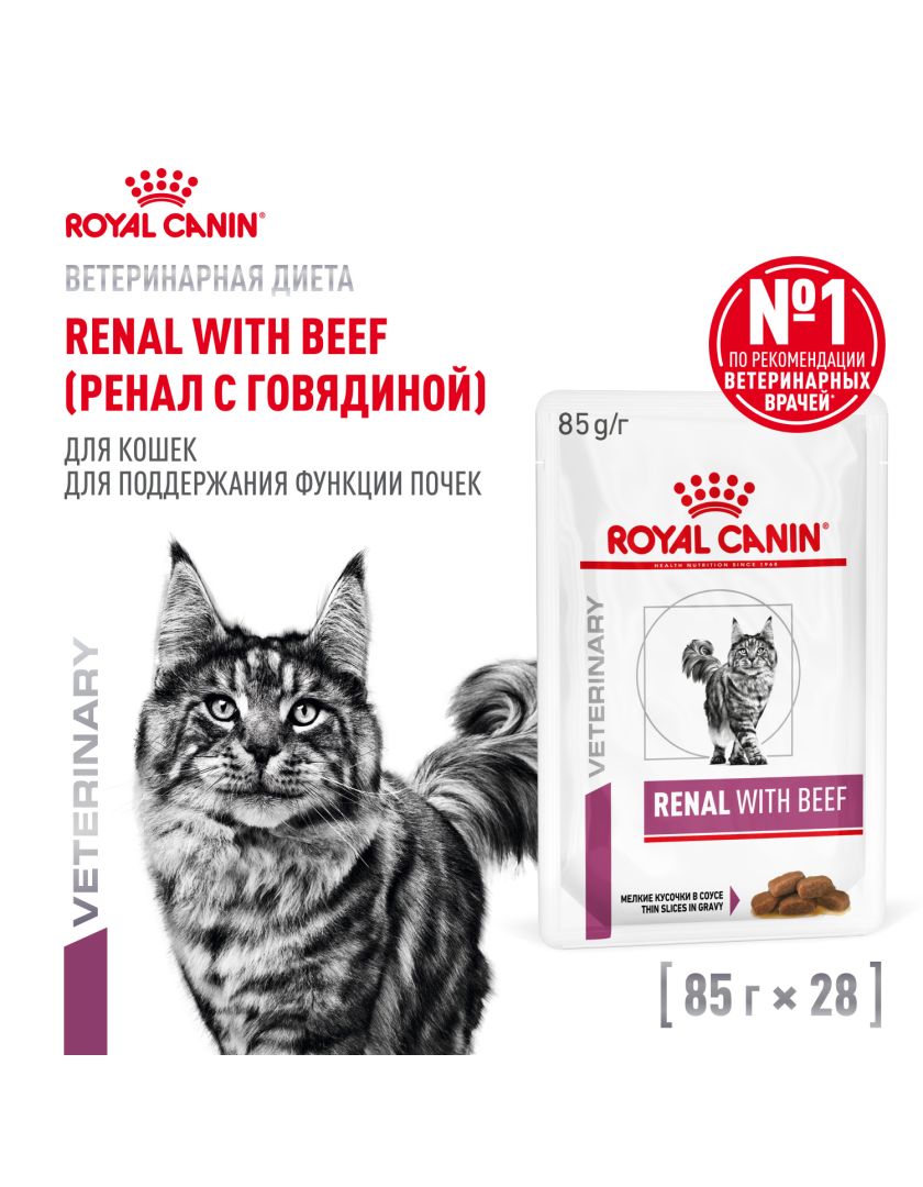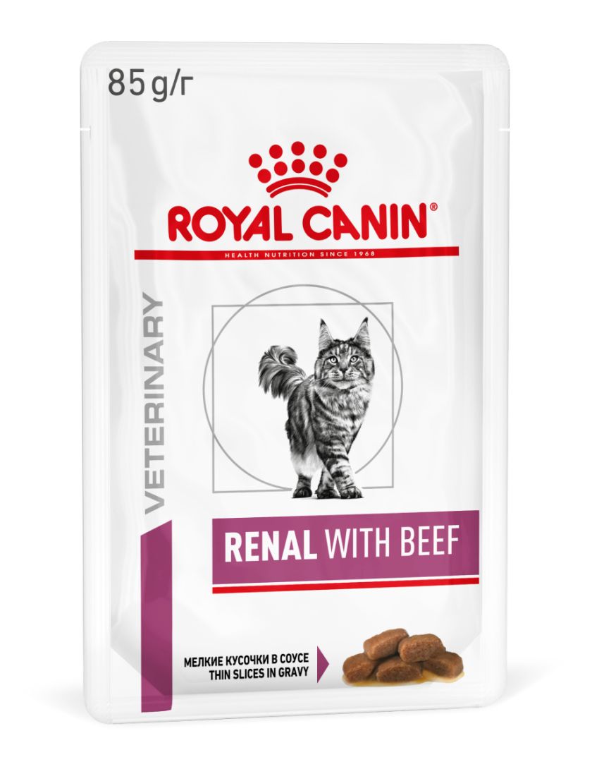 Влажный корм ROYAL CANIN® RENAL WITH BEEF (РЕНАЛ С ГОВЯДИНОЙ), мелкие кусочки в соусе - полнорационный диетический корм для взрослых кошек для поддержания функции почек при хронической болезни почек. Пониженное содержание фосфора и умеренное количество белка помогают поддерживать функции почек. Специально разработанный ароматический профиль помогает удовлетворить особые вкусовые предпочтения кошки
