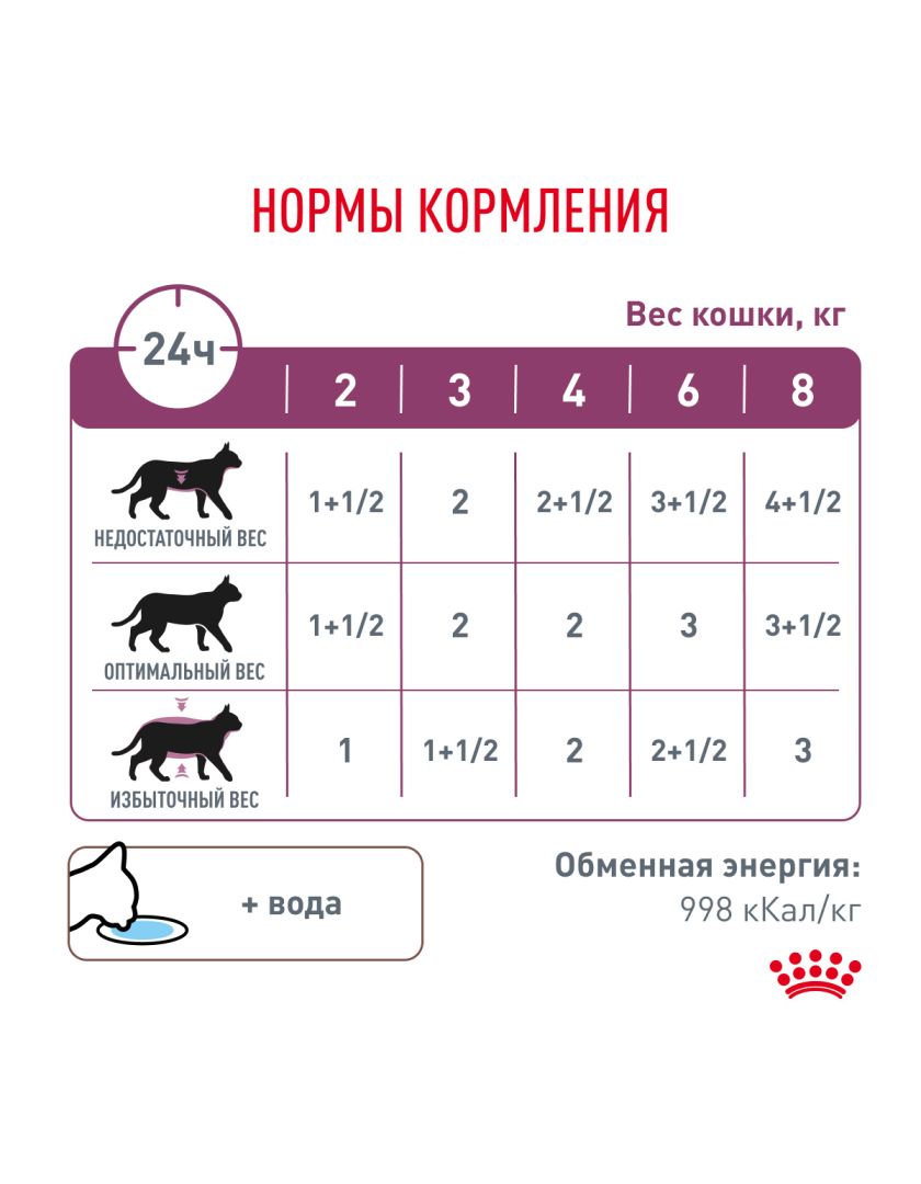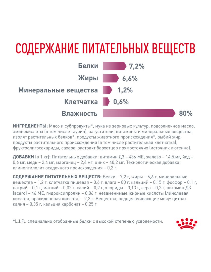 ДОБАВЛЕННЫЕ ВЕЩЕСТВА (в 1 кг): витамин D3 – 440 МЕ, железо – 14 мг, йод – 0,6 мг, медь – 2,3 мг, марганец – 2,3 мг, цинк – 39 мг. СОДЕРЖАНИЕ ПИТАТЕЛЬНЫХ ВЕЩЕСТВ (100 г): белки – 7,4 г, жиры – 6,7 г, зола – 1,2 г, клетчатка пищевая – 0,6 г, влага – 80 г, кальций – 0,15 г, фосфор – 0,1 г, натрий – 0,1 г, магний – 0,02 г, калий – 0,2 г, хлориды – 0,13 г, сера – 0,2 г, витамин Д3 (всего) – 46 МЕ, гидроксипролин – 0,06 г, незаменимые жирные кислоты (линолевая кислота, арахидоновая кислота) – 2,2 г. Вещества, подщелачивающие мочу: цитрат калия – 0,35 г, кальция карбонат – 0,25 г. СПОСОБ УПОТРЕБЛЕНИЯ: см. таблицу. Корм готов к употреблению. Проследите, чтобы у вашей кошки всегда была свежая вода.