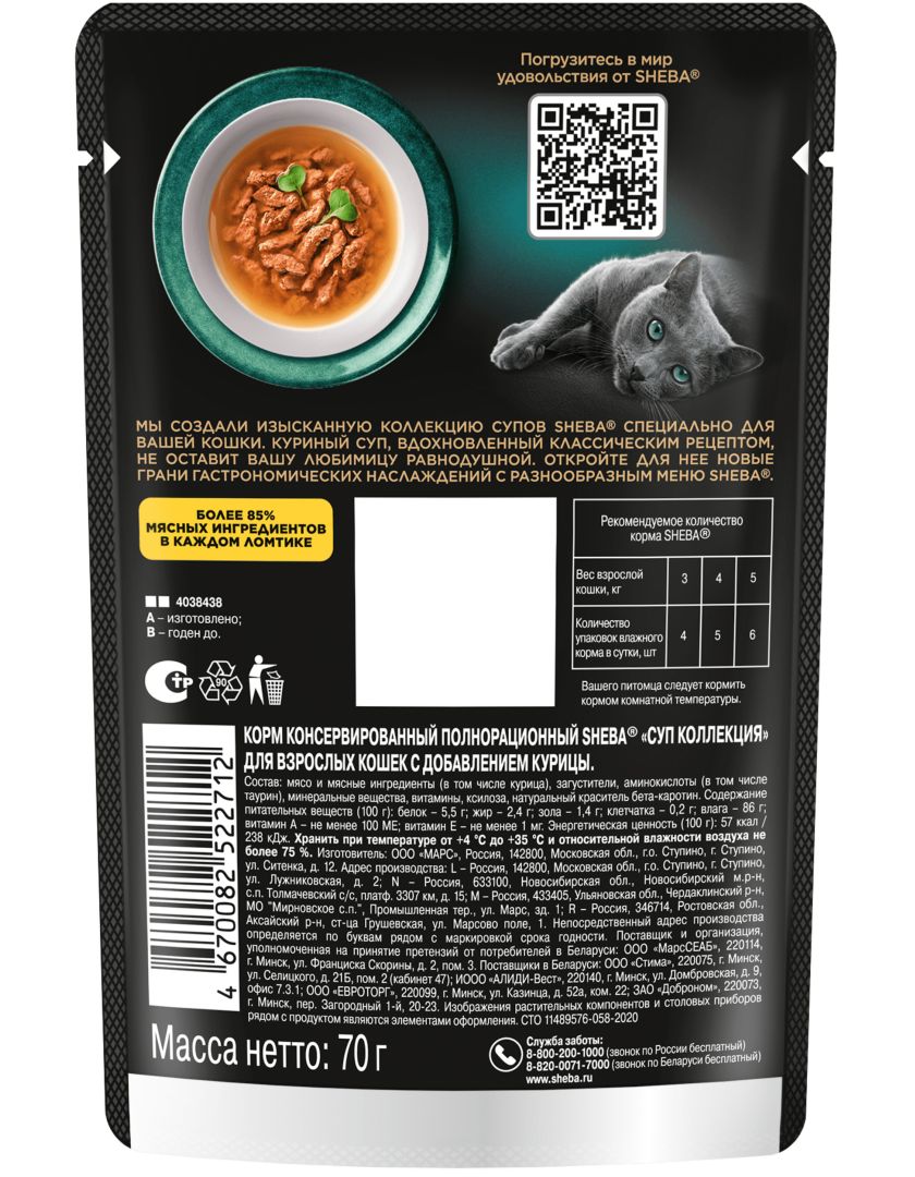 Полнорационный консервированный корм SHEBA «СУП КОЛЛЕКЦИЯ» для взрослых кошек с добавлением курицы.