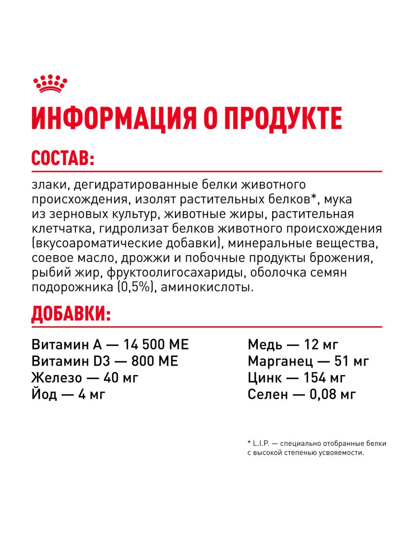 ИНГРЕДИЕНТЫ: злаки, дегидратированные белки животного происхождения, изолят растительных белков*, мука из зерновых культур, животные жиры, растительная клетчатка, гидролизат белков животного происхождения (вкусоароматические добавки), минеральные вещества, соевое масло, дрожжи и побочные продукты брожения, рыбий жир, фруктоолигосахариды, оболочка семян подорожника (0,5%), аминокислоты.