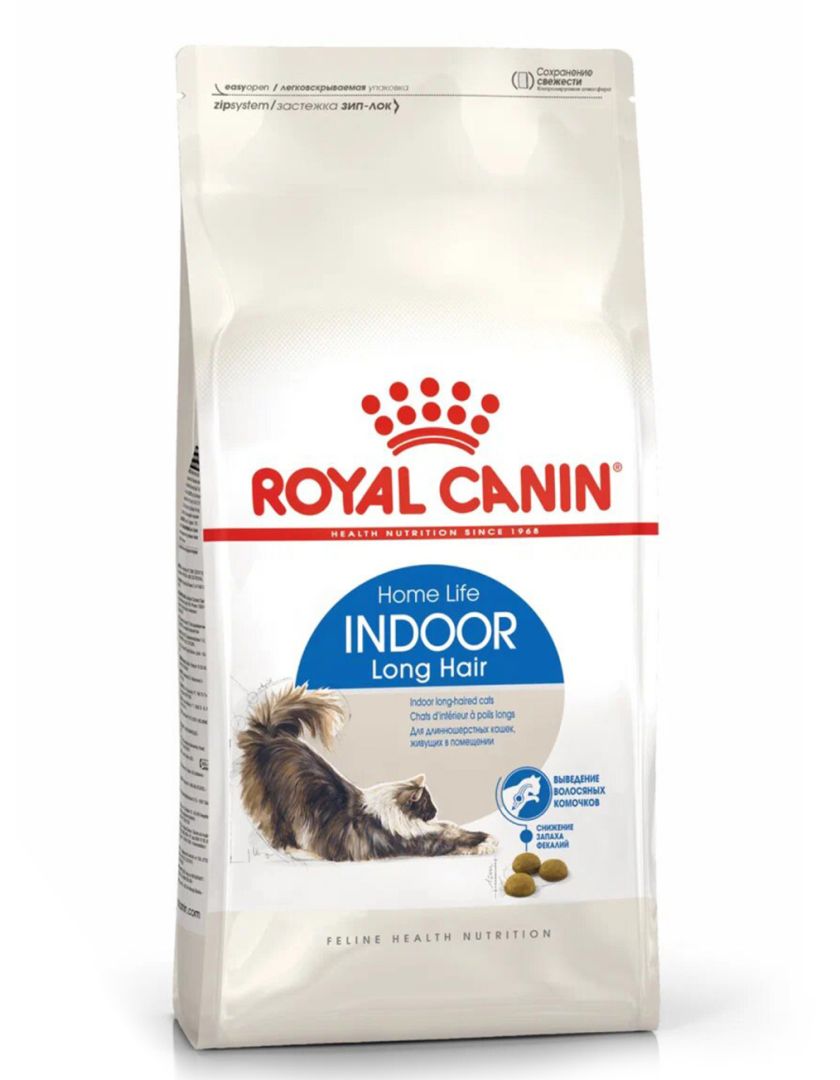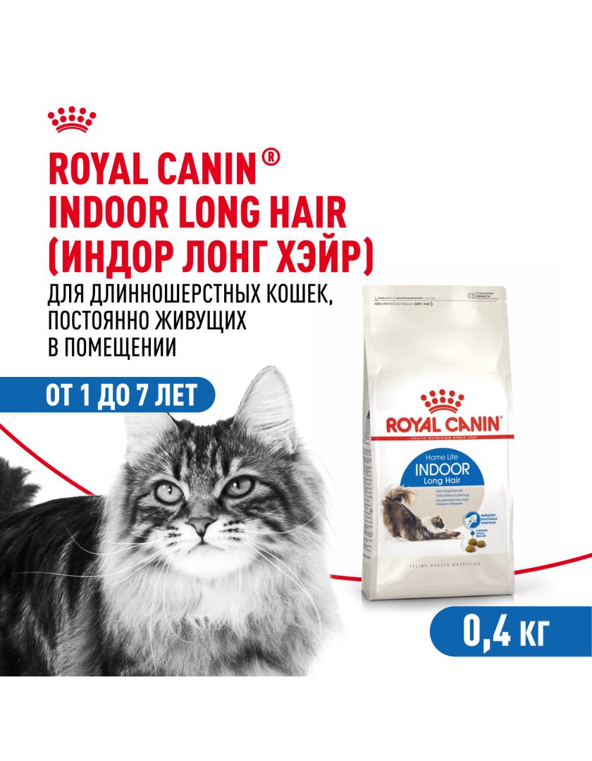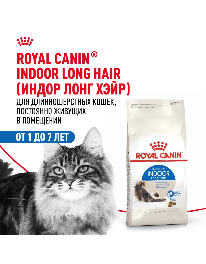 Корм сухой полнорационный сбалансированный для взрослых длинношерстных кошек (в возрасте от 1 года до 7 лет), живущих в помещении INDOOR LONG HAIR (ИНДОР ЛОНГ ХЭЙР) ROYAL CANIN®, подходящий для длинношерстных кошек, постоянно живущих в помещении, в возрасте от 1 года до 7 лет, специально разработан с учетом потребностей вашей кошки в питательных веществах.