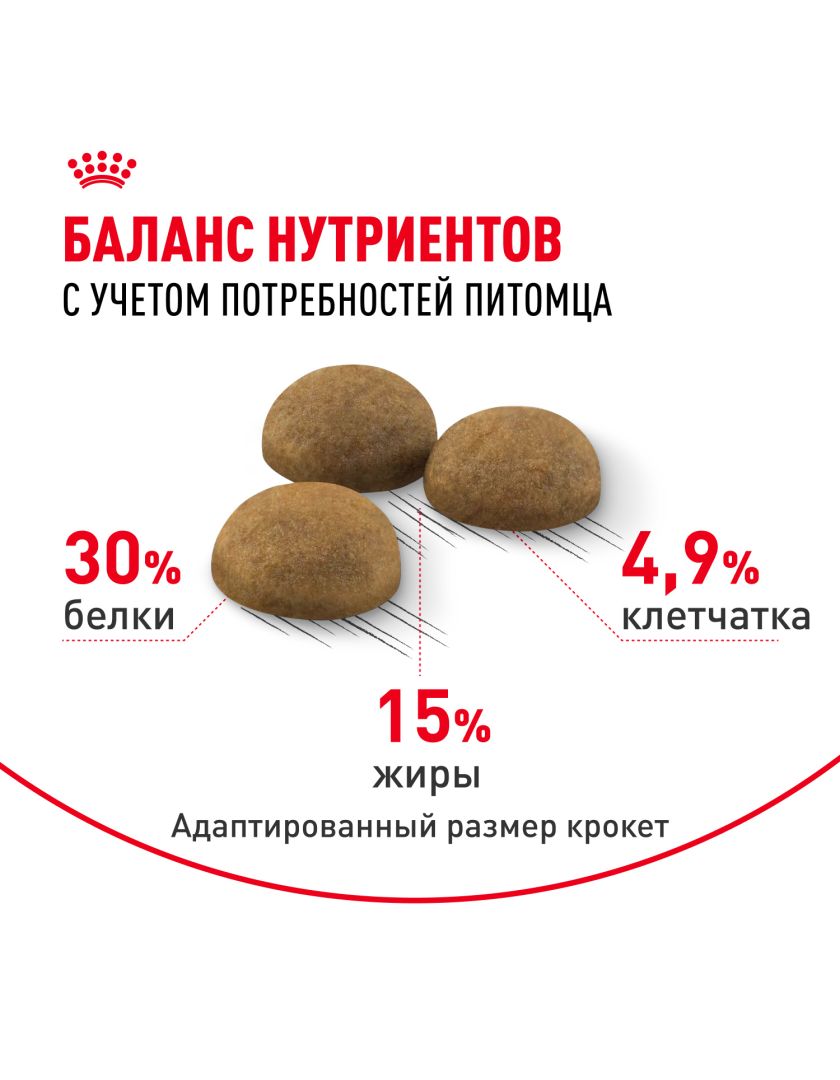 Помогает поддерживать оптимальный вес благодаря ограниченному содержанию жиров, оптимальному уровню белков и входящему в состав корма L-карнитину.