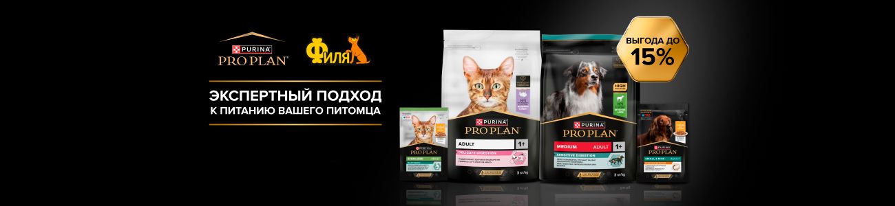 Скидки до 15% на сухие и влажные корма Pro Plan для кошек и собак.